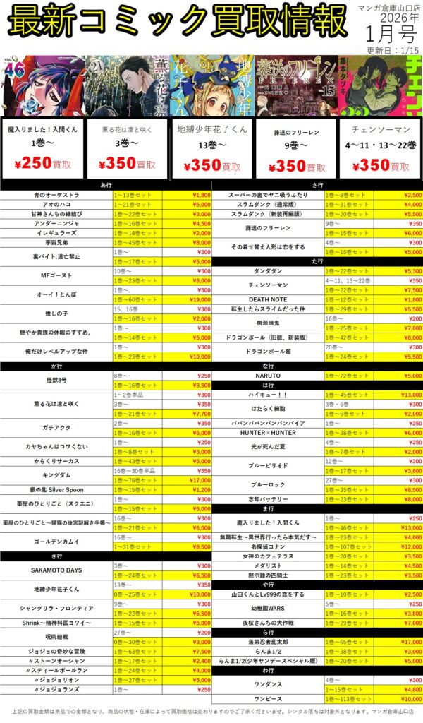 ■1月分 買取告知■ タイプ: 本, 絵本 ※買取金額は、状態、在庫状況により変動致します。 2026年1月19日更新 ※上記の買取金額は美品での金額となり、商品の状態・在庫によって買取価格は変わりますのでご了承くださいませ。レンタル落ちは対象外となります ■本買取実績■ タイプ: 本