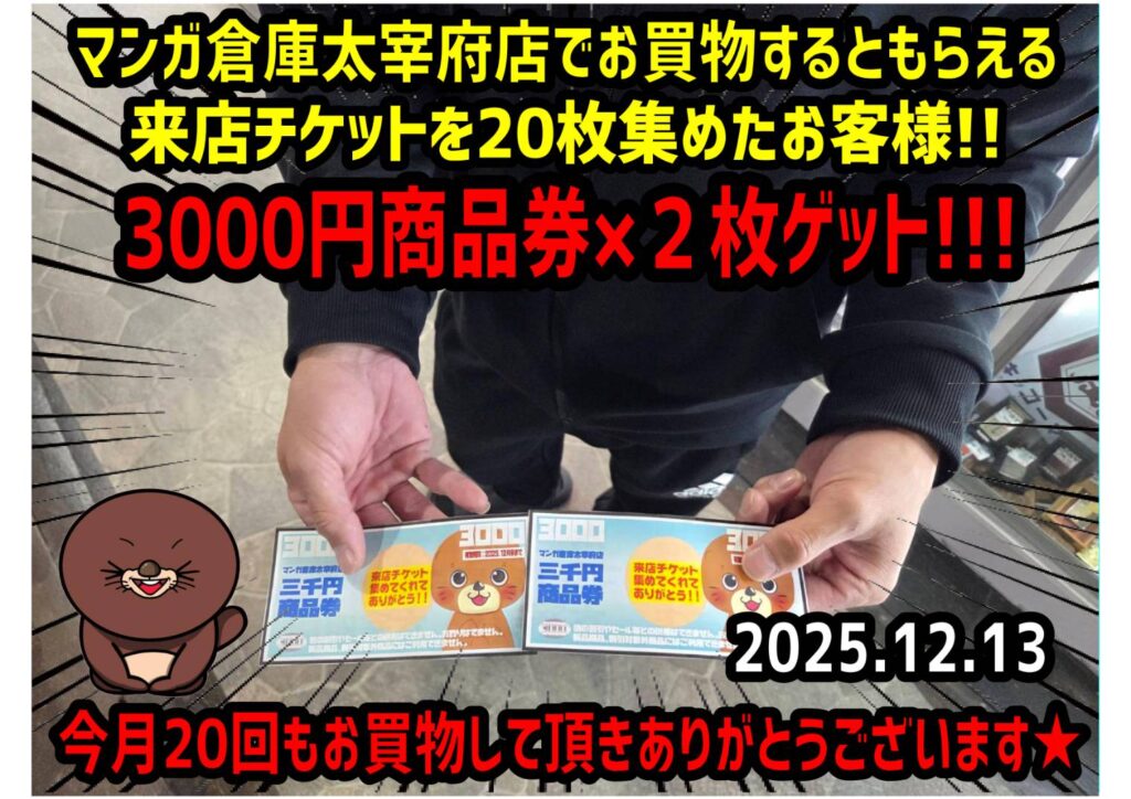 まだ12月13日なのに今月20回も来店して3000円商品券を2枚ゲットされた…