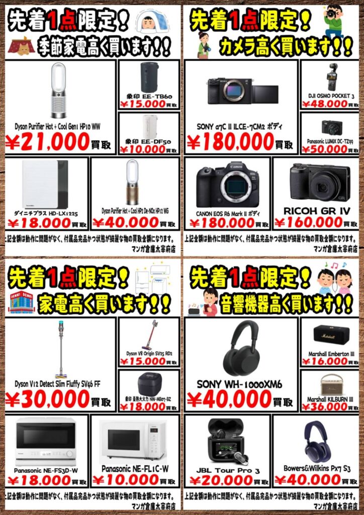 先着1点限定で、対象のモデルの音響機器、カメラ、生活家電を高価買取…