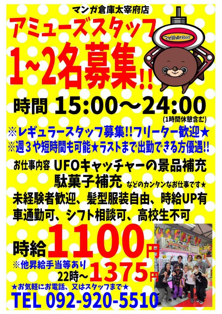 マンガ倉庫太宰府店アミューズスタッフ募集中!! 景品補充や駄菓子の…