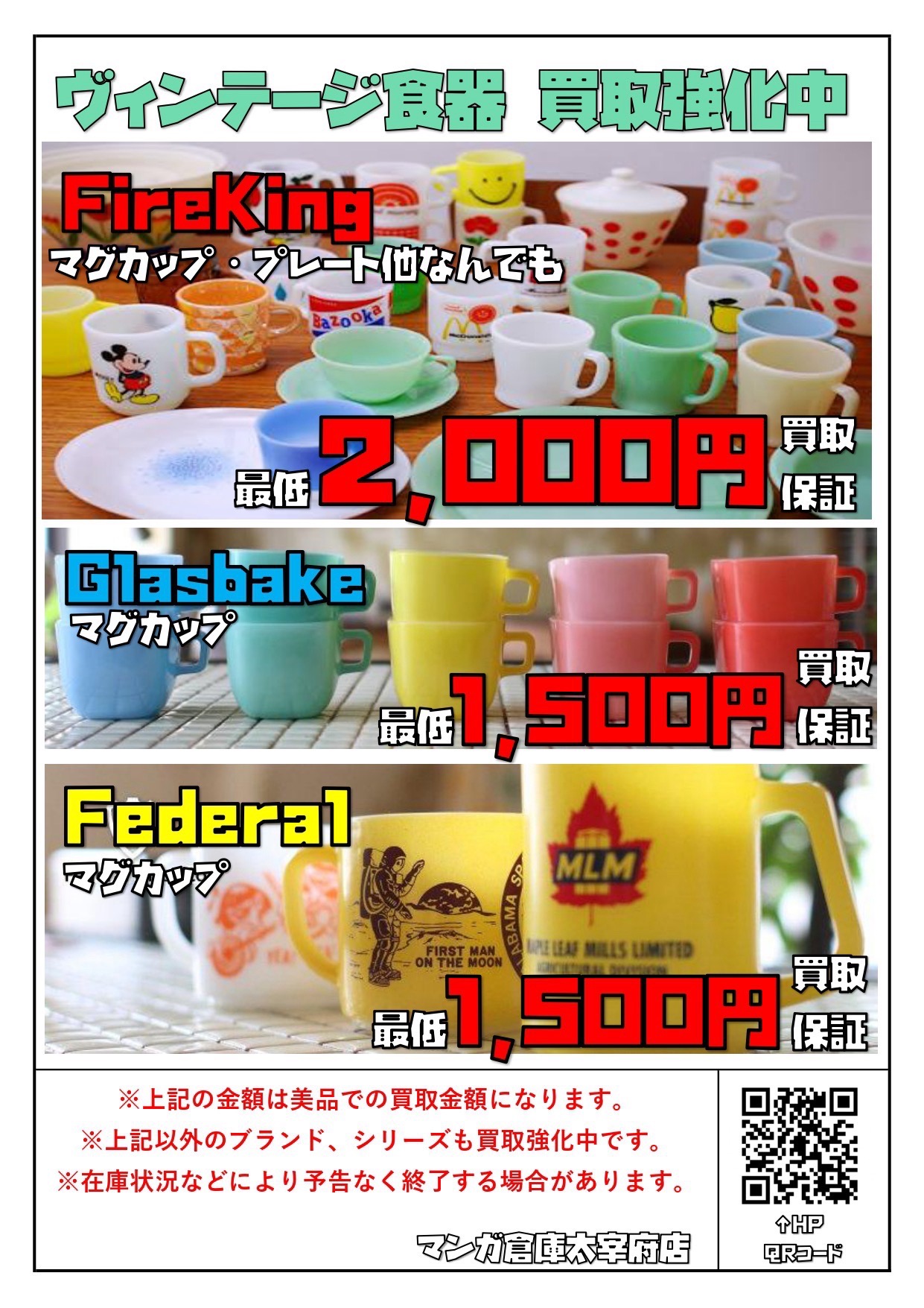 ヴィンテージ食器の買取保証はじめます!!#マンガ倉庫太宰府店 #食器 #FireKing #Glasbake #Federal #福岡 #太宰府 #買取 家電/雑貨 買取告知 2025年2月8日 ヴィンテージ食器の買取保証はじめます!! Glasbake、Federalのマグカップは1500円買取保証! FireKingなら種類を問わず2000円買取保証! ぜひ、マンガ倉庫太宰府店までお持ちください! ★店舗《Instagram / Twitter》フォローお願いします★ ★買取告知・イベント情報はこちら★ ★各部門の買取・入荷情報はこちら★ 共有: クリックして X で共有 (新しいウィンドウで開きます) X Facebook で共有するにはクリックしてください (新しいウィンドウで開きます) Facebook
