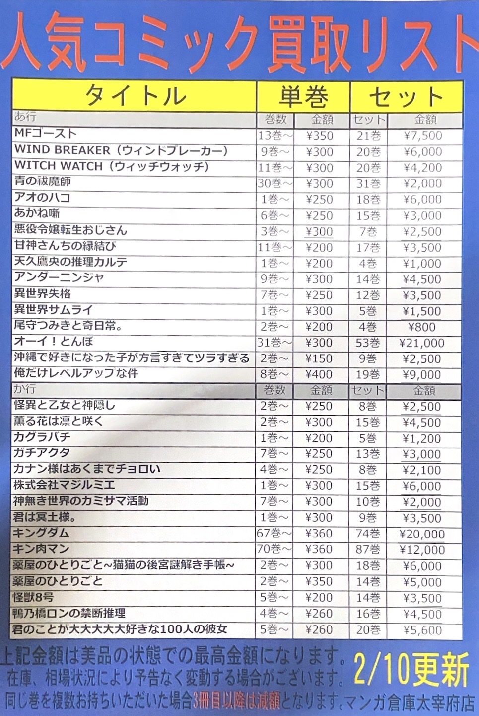 ■コミック査定表更新しました!■ #コミック #セットコミック #買取 #冬アニメ #マンガ倉庫太宰府店 #太宰府 NEW コミック/書籍 マンガ倉庫大宰府店 買取告知 2025年2月10日 コミック査定表更新しました! 画像以外のタイトルは店舗ホームページのwebチラシからご覧下さい! ★店舗《Instagram / Twitter》フォローお願いします★ ★買取告知・イベント情報はこちら★ ★各部門の買取・入荷情報はこちら★ 共有: クリックして X で共有 (新しいウィンドウで開きます) X Facebook で共有するにはクリックしてください (新しいウィンドウで開きます) Facebook