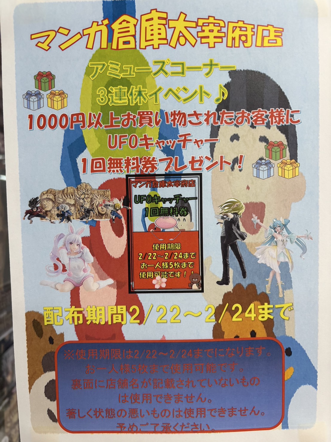 3連休マンガ倉庫太宰府店で1000円以上お買い物されお客様にUFOキャッチャー1回無料券プレゼントしちゃいます✨#マンガ倉庫太宰府店 #アミューズ #クレゲ #プライズ #フィギュア #NARUTO #サカモトデイズ #太宰府 NEW アミューズ イベント情報! 2025年2月22日 3連休マンガ倉庫太宰府店で1000円以上お買い物されお客様にUFOキャッチャー1回無料券プレゼントしちゃいます✨ 他にも個数制限緩和台など色々ありますのでぜひ3連休はマンガ倉庫太宰府店にお越し下さい!!! ★店舗《Instagram / Twitter》フォローお願いします★ ★買取告知・イベント情報はこちら★ ★各部門の買取・入荷情報はこちら★ 共有: クリックして X で共有 (新しいウィンドウで開きます) X Facebook で共有するにはクリックしてください (新しいウィンドウで開きます) Facebook