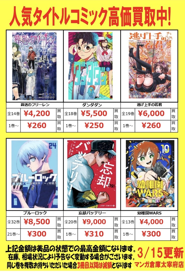 ■コミック査定表更新しています!◆#マンガ倉庫太宰府店 #太宰府 #買取 #コミック #ダンダダン #メダリスト #ブルーロック■ コミック/書籍 買取告知 2025年3月15日 コミック査定表更新しています! 詳細なタイトルは是非店舗HPのwebチラシでご確認ください!お持ち込みお待ちしております! ※2025/3/15現在の価格となります。 在庫状況などによってお値段が変動いたします。予めご了承ください。 ★店舗《Instagram / Twitter》フォローお願いします★ ★買取告知・イベント情報はこちら★ ★各部門の買取・入荷情報はこちら★ 共有: クリックして X で共有 (新しいウィンドウで開きます) X Facebook で共有するにはクリックしてください (新しいウィンドウで開きます) Facebook