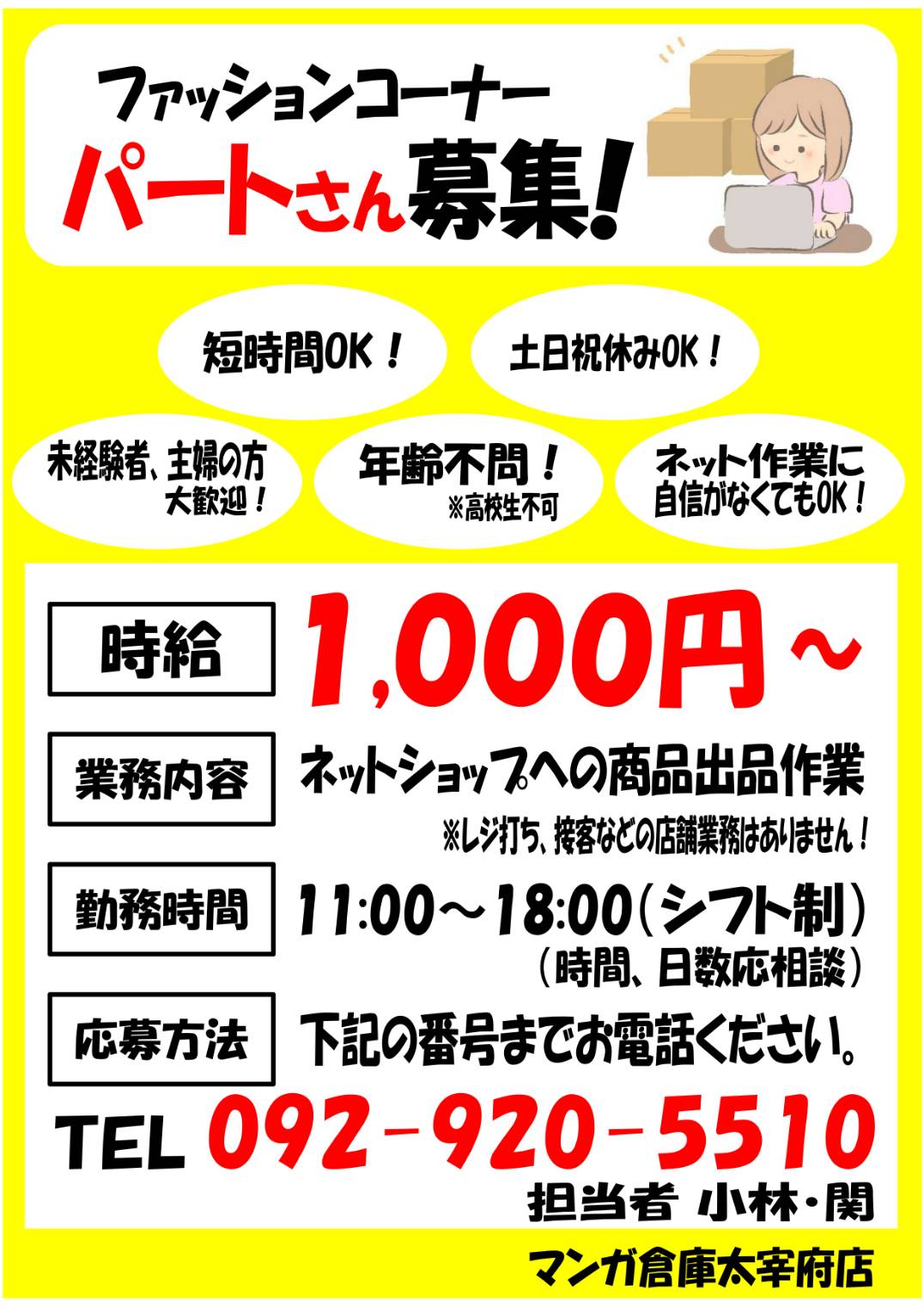 ■ファッションコーナーパートさん募集中!◆#マンガ倉庫 #マンガ倉庫太宰府店 #福岡 #春日 #筑紫野 #太宰府 #大野城 #パート #パート募集■ ファッション 求人 2025年4月26日 マンガ倉庫太宰府店では、ファッションコーナーの商品をネットショップに出品する作業をしていただけるパートさんを大募集中でございます!! 土日祝休み、短時間OK! 簡単な作業なので、主婦の方やネット作業に自信の無い未経験の方も大歓迎です! お気軽にご応募下さい! 担当者:小林または関あてにお電話お願いします。 ★店舗《Instagram / Twitter》フォローお願いします★ ★買取告知・イベント情報はこちら★ ★各部門の買取・入荷情報はこちら★ 共有: クリックして X で共有 (新しいウィンドウで開きます) X Facebook で共有するにはクリックしてください (新しいウィンドウで開きます) Facebook