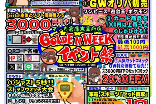 ■3000円以下のセットコミック20%OFFセールを開催しています!■ #コミック #セットコミック #セール #マンガ倉庫太宰府店 #太宰府 NEW イベント情報! コミック/書籍 マンガ倉庫大宰府店 2025年4月26日 3000円以下のセットコミック20%OFFセールを開催しています! (一部セール対象外もございます) マンガ倉庫太宰府店にはセットコミックの在庫たくさんあります! まとめて読みたい作品をこの機会にお買い得な価格で買っちゃいましょう! 是非GWはマンガ倉庫太宰府店までお越しください! ★店舗《Instagram / Twitter》フォローお願いします★ ★買取告知・イベント情報はこちら★ ★各部門の買取・入荷情報はこちら★ 共有: クリックして X で共有 (新しいウィンドウで開きます) X Facebook で共有するにはクリックしてください (新しいウィンドウで開きます) Facebook