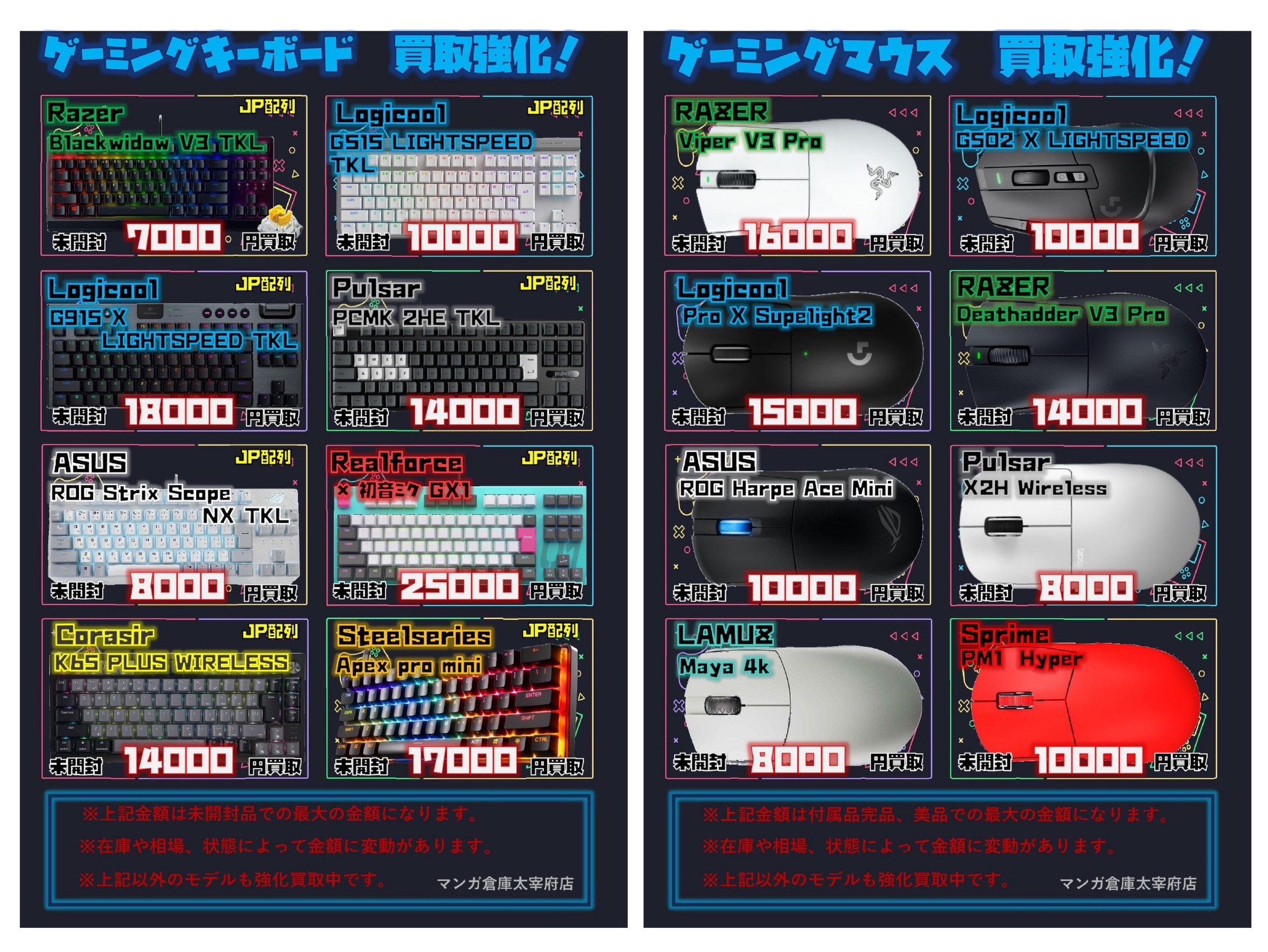 ■ゲーミングマウス、キーボードの買取告知更新しました!!■ #マンガ倉庫太宰府店 #ゲーミングマウス #ゲーミングキーボード #Razer #Logicool #福岡 #太宰府 #買取 NEW マンガ倉庫大宰府店 家電/雑貨 買取告知 2025年5月3日 ゲーミングマウス、キーボードの買取告知更新しました!! RazerやLogicoolなど買取超強化中です! 大量持ち込みも大歓迎!! ぜひ、マンガ倉庫太宰府店までおもちください!! ※2025/5/3 現在の価格となります。 在庫状況・状態によってお値段が変動いたします。予めご了承ください。 ★店舗《Instagram / Twitter》フォローお願いします★ ★買取告知・イベント情報はこちら★ ★各部門の買取・入荷情報はこちら★ 共有: クリックして X で共有 (新しいウィンドウで開きます) X Facebook で共有するにはクリックしてください (新しいウィンドウで開きます) Facebook