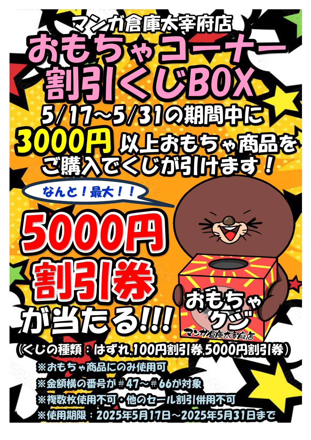 ■《5月17日~31日》おもちゃコーナー割引くじBOXのお知らせ!◆#マンガ倉庫太宰府店 #おもちゃ #太宰府 #割引 #ドラゴンボール #ワンピース #仮面ライダー #ガンダム #TOY #イベント■ おもちゃ イベント情報! 2025年5月17日 おもちゃコーナーからお知らせ! おもちゃ商品3000円以上ご購入で最大5000円割引券が当たるくじが引けちゃいます🧧 さらに1000円以上おもちゃ商品購入でUFOキャッチャー1回無料券もプレゼントしちゃいます✨✨ ぜひマンガ倉庫太宰府店にお越し下さい♪ ★店舗《Instagram / Twitter》フォローお願いします★ ★買取告知・イベント情報はこちら★ ★各部門の買取・入荷情報はこちら★ 共有: クリックして X で共有 (新しいウィンドウで開きます) X Facebook で共有するにはクリックしてください (新しいウィンドウで開きます) Facebook