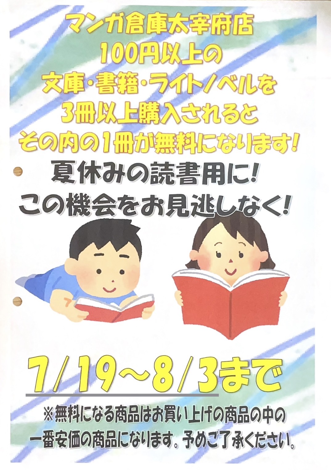 ■マンガ倉庫太宰府店、本コーナーの夏休みイベント📚■ #本 #文庫 #ライトノベル #夏休み #マンガ倉庫太宰府店 イベント情報! コミック/書籍 2025年7月19日 マンガ倉庫太宰府店、本コーナーの夏休みイベントは 100円以上の文庫・書籍・ライトノベルを3冊以上お買い上げの場合 その内1冊を無料でお渡しさせて頂くキャンペーンを行います! 長い夏休み、読書を楽しんじゃいましょう! ★店舗《Instagram / Twitter》フォローお願いします★ ★買取告知・イベント情報はこちら★ ★各部門の買取・入荷情報はこちら★ 共有: クリックして X で共有 (新しいウィンドウで開きます) X Facebook で共有するにはクリックしてください (新しいウィンドウで開きます) Facebook