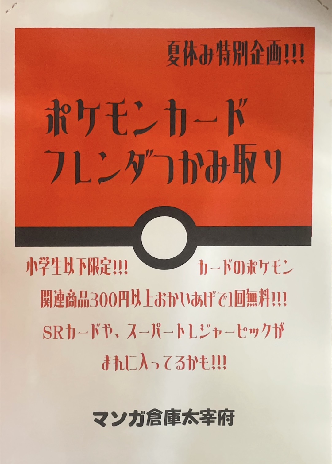 ■カードコーナー《小学生以下のお子様限定》夏休みイベント!■ #ポケモンカード #ポケカ #ポケモンフレンダ #夏休み #マンガ倉庫太宰府店 #太宰府 NEW イベント情報! カード 2025年7月19日 マンガ倉庫太宰府店カードコーナーより、小学生以下のお子様限定の夏休みイベント! ポケモンカード、フレンダを300円以上お買い上げ時にポケカorフレンダのつかみ取りができちゃいます! 中にはレアな物も? 是非マンガ倉庫太宰府店まで遊びに来てください! ★店舗《Instagram / Twitter》フォローお願いします★ ★買取告知・イベント情報はこちら★ ★各部門の買取・入荷情報はこちら★ 共有: クリックして X で共有 (新しいウィンドウで開きます) X Facebook で共有するにはクリックしてください (新しいウィンドウで開きます) Facebook