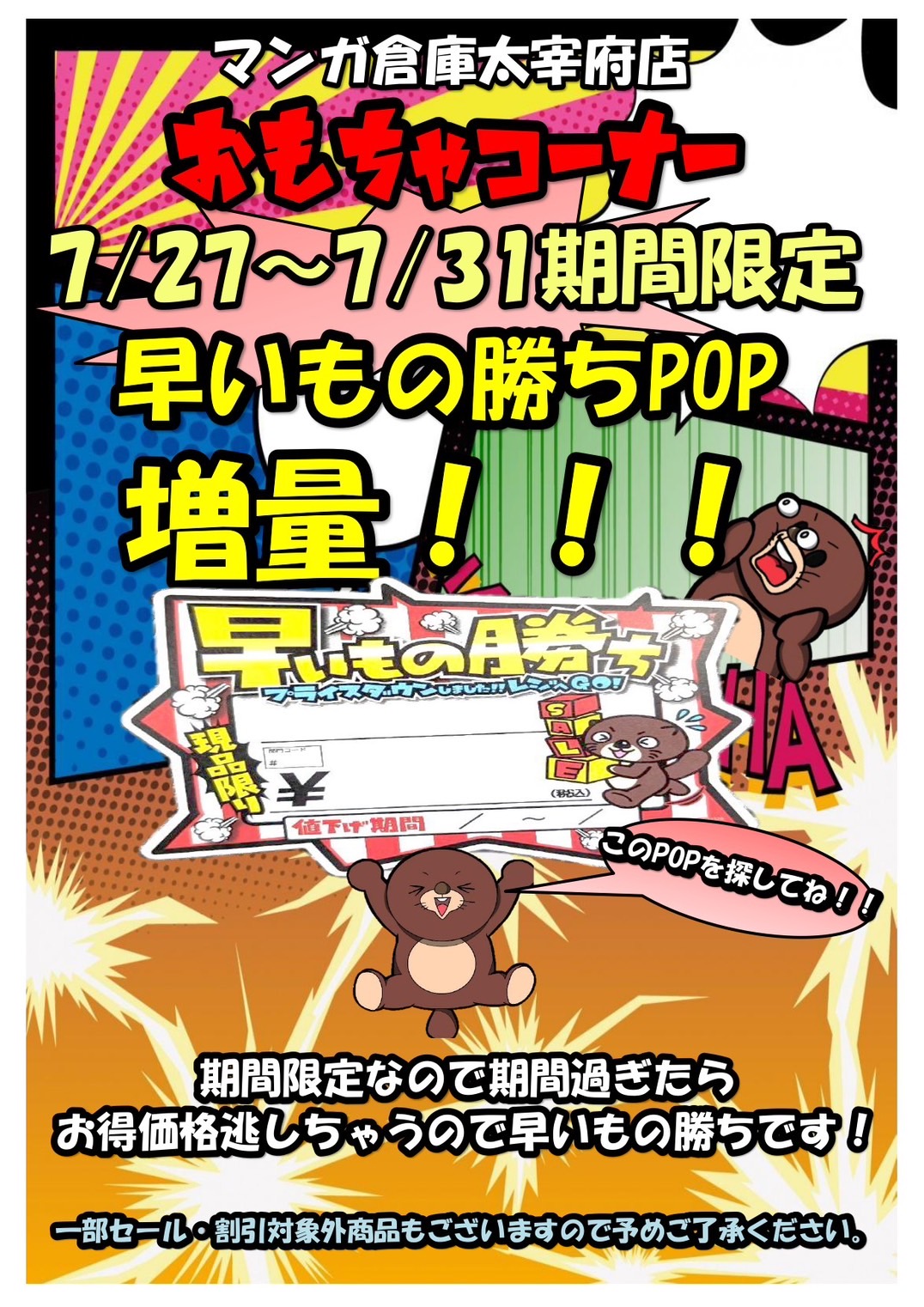 ■《7月27日~31日》おもちゃコーナー期間限定で早い者勝ちPOP増量!!!!◆#マンガ倉庫太宰府店 #おもちゃ #イベント #セール #フィギュア #ドラゴンボール #ワンピース #ガンダム■ おもちゃ お知らせ 2025年7月27日 おもちゃコーナー期間限定で早い者勝ちPOP増量!!!! 7/27〜7/31までの期間だけ!! 人気商品がお得なお値段で買えちゃいます🤩 期間限定でもし売れなければ価格が元の値段に戻っちゃいます🙂↕️ ぜひマンガ倉庫太宰府店のおもちゃコーナーにお越し下さい✨✨ ★店舗《Instagram / Twitter》フォローお願いします★ ★買取告知・イベント情報はこちら★ ★各部門の買取・入荷情報はこちら★ 共有: クリックして X で共有 (新しいウィンドウで開きます) X Facebook で共有するにはクリックしてください (新しいウィンドウで開きます) Facebook