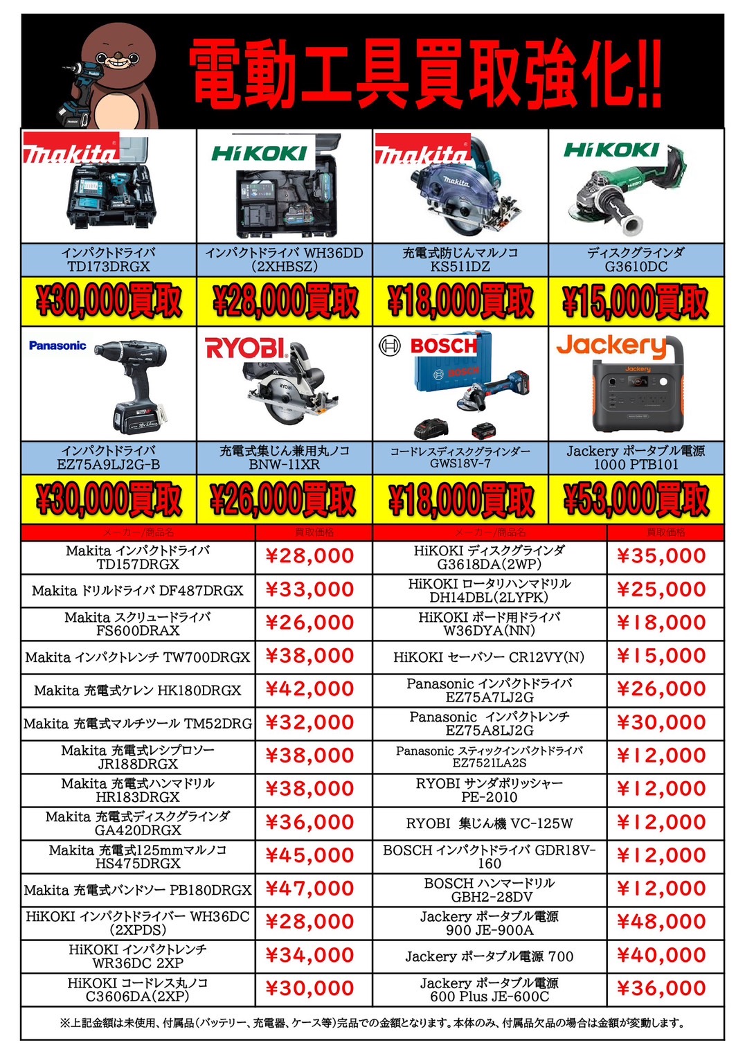 ■電動工具買取告知更新しました!■ #工具 #電動工具 #Makita #HiKOKI #買取 #福岡 #太宰府 #マンガ倉庫太宰府店 NEW マンガ倉庫大宰府店 買取告知 電動工具 2025年8月2日 電動工具買取告知更新しました! マンガ倉庫太宰府店では電動工具の買取大募集中です! ぜひ当店までお持ち込みください! ※2025/8/2 現在の価格となります。 在庫状況・状態によってお値段が変動いたします。予めご了承ください。 ★店舗《Instagram / Twitter》フォローお願いします★ ★買取告知・イベント情報はこちら★ ★各部門の買取・入荷情報はこちら★ 共有: クリックして X で共有 (新しいウィンドウで開きます) X Facebook で共有するにはクリックしてください (新しいウィンドウで開きます) Facebook