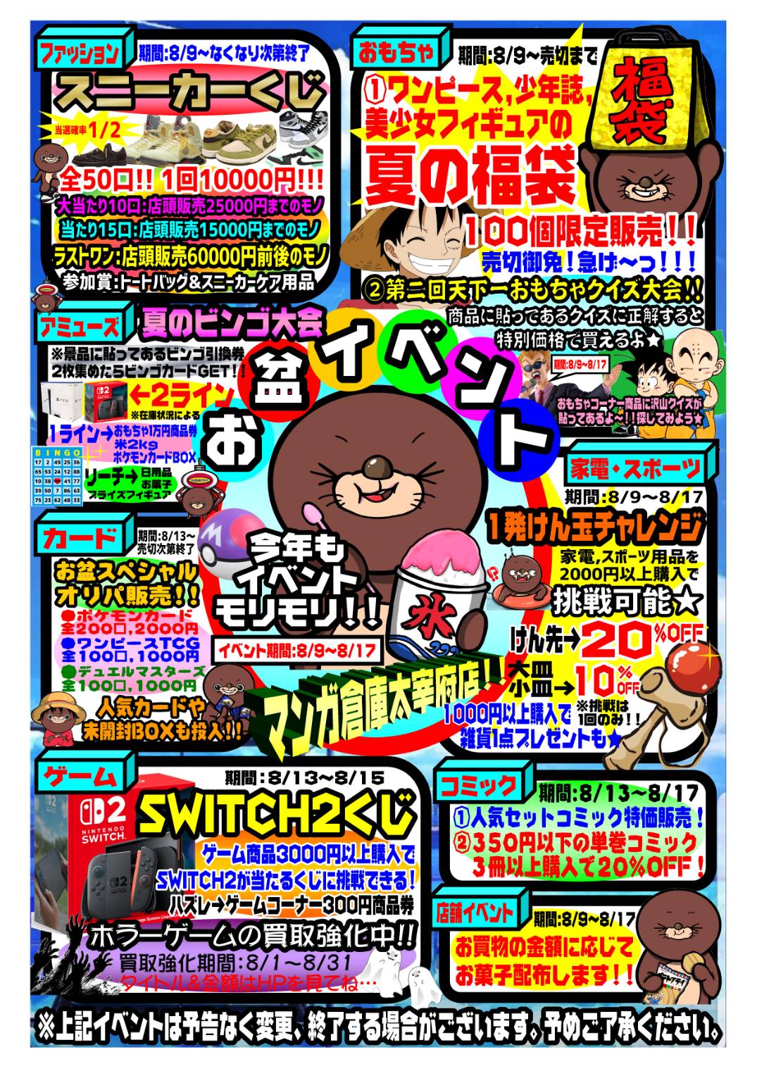 始まりました~!!!!!! お盆イベント~!!!!!!!#マンガ倉庫太宰府店 #イベント #お盆 #ビンゴ #くじ #SWITCH2 #オリパ #セール #スニーカー #太宰府 #福岡 #福袋 おもちゃ アミューズ イベント情報! カード ゲーム コミック/書籍 スポーツ ファッション 家電/雑貨 2025年8月9日 始まりました~!!!!!! お盆イベント~!!!!!!! おもちゃ夏の福袋、スニーカーくじ、SWITCH2くじ、お盆オリパ…早く来ないと無くなるよ~★(マジで) けん玉上手な人は家電コーナーにおいで! ビンゴもお菓子もあるよ★★ ★店舗《Instagram / Twitter》フォローお願いします★ ★買取告知・イベント情報はこちら★ ★各部門の買取・入荷情報はこちら★ 共有: クリックして X で共有 (新しいウィンドウで開きます) X Facebook で共有するにはクリックしてください (新しいウィンドウで開きます) Facebook