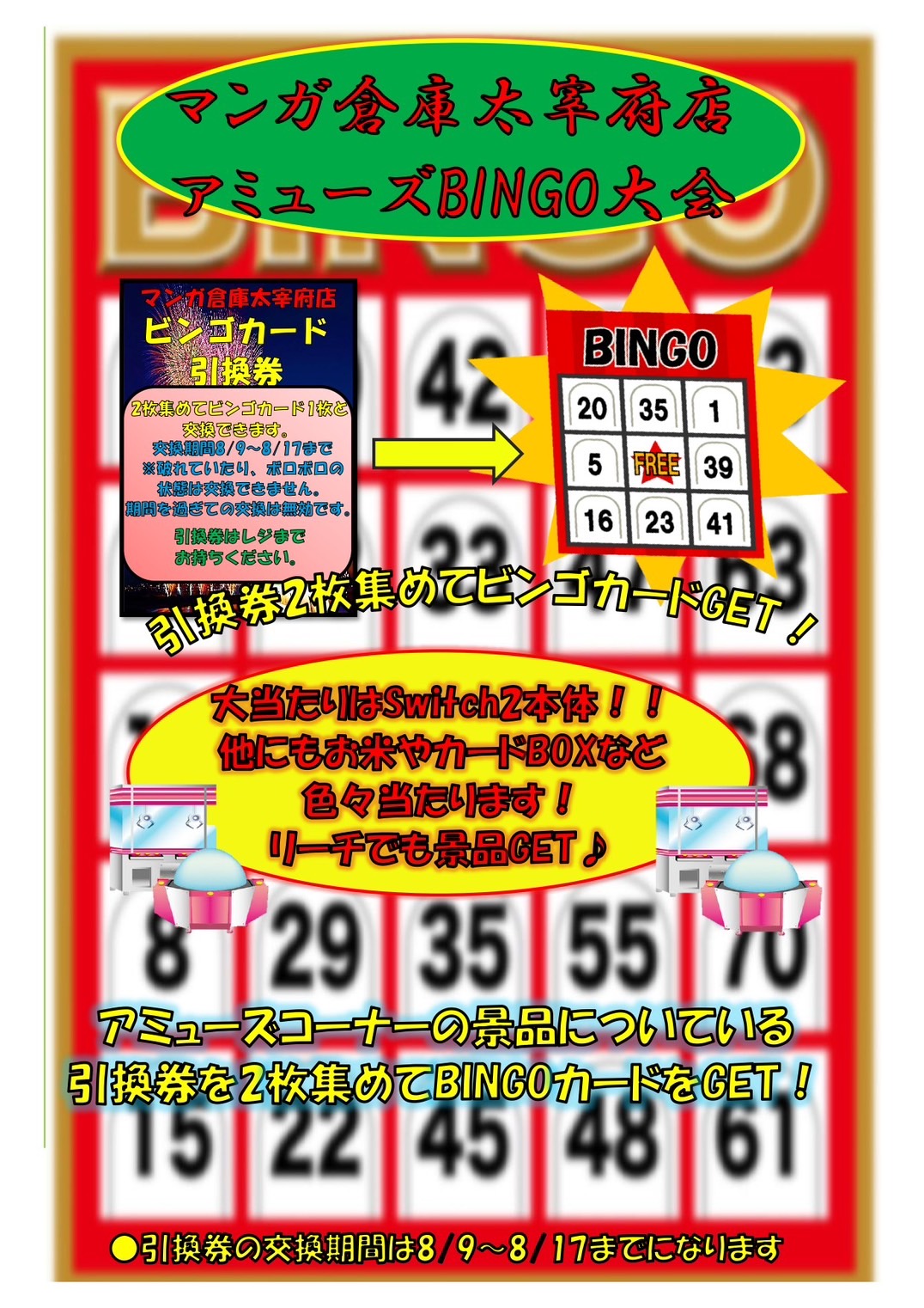 マンガ倉庫太宰府店アミューズコーナービンゴ大会開催中✨✨ #マンガ倉庫太宰府店 #太宰府 #クレゲ #アミューズ #ビンゴ #セール #イベント NEW アミューズ イベント情報! 2025年8月9日 マンガ倉庫太宰府店アミューズコーナービンゴ大会開催中✨✨ 大当たりはSwitch2本体!! 他にもポケモンカードのBOXやおもちゃ1万円商品券など 色々当たっちゃいます! キャッチャー景品についてる引換券を2枚集めてビンゴカード1枚と交換! 簡単な設定にもついてるので誰でも挑戦できます✨ ぜひマンガ倉庫太宰府店アミューズコーナーにお越し下さい! ★店舗《Instagram / Twitter》フォローお願いします★ ★買取告知・イベント情報はこちら★ ★各部門の買取・入荷情報はこちら★ 共有: クリックして X で共有 (新しいウィンドウで開きます) X Facebook で共有するにはクリックしてください (新しいウィンドウで開きます) Facebook