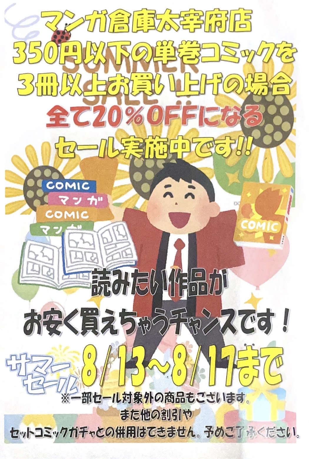コミックコーナーからお盆限定のビッグなイベント!#コミック #セール #お盆 #マンガ倉庫太宰府店 #太宰府 #福岡 イベント情報! コミック/書籍 2025年8月13日 コミックコーナーからお盆限定のビッグなイベント! 350円以下の単巻コミックを3冊以上お買い上げの場合、全て20%OFFになるセールを開催しています!欲しかったあの作品、揃えたかったあの作品をお得に買えちゃうチャンスです!是非この機会をご利用下さい!! ★店舗《Instagram / Twitter》フォローお願いします★ ★買取告知・イベント情報はこちら★ ★各部門の買取・入荷情報はこちら★ 共有: クリックして X で共有 (新しいウィンドウで開きます) X Facebook で共有するにはクリックしてください (新しいウィンドウで開きます) Facebook