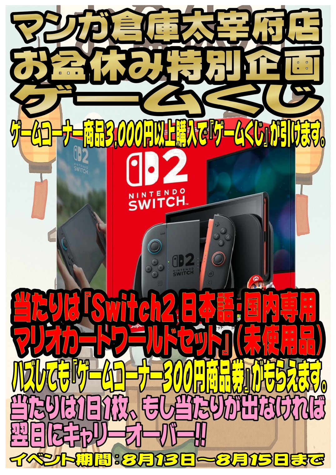 ■マンガ倉庫太宰府店のゲームコーナーからお盆休みの特別企画!!■ #マンガ倉庫太宰府店 #ゲーム #Switch2 ゲーム 2025年8月13日 13日、14日、15日の3日間ゲームコーナーの商品を3,000円以上購入で Switch2本体が当たるくじが引けます‼︎ 更にその日に当たりが出なかったら翌日にキャリーオーバー‼︎ 是非この機会にゲームコーナーでお買い物してくじに挑戦してみて下さい‼︎ ★店舗《Instagram / Twitter》フォローお願いします★ ★買取告知・イベント情報はこちら★ ★各部門の買取・入荷情報はこちら★ 共有: クリックして X で共有 (新しいウィンドウで開きます) X Facebook で共有するにはクリックしてください (新しいウィンドウで開きます) Facebook