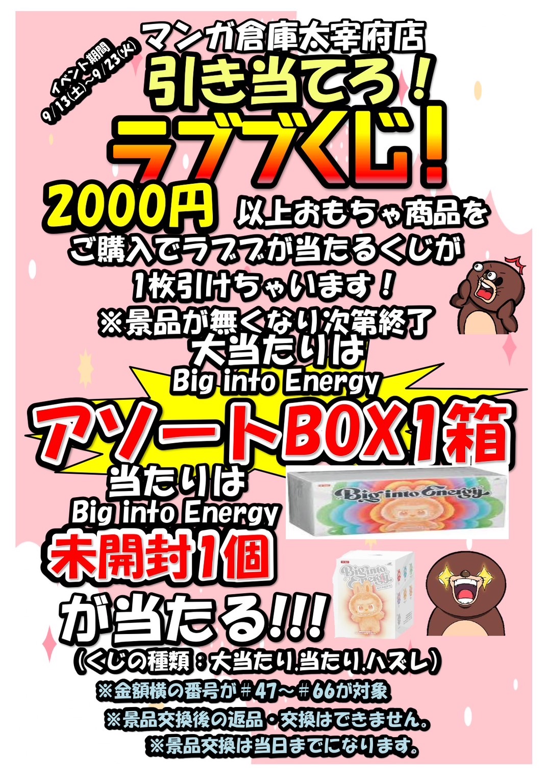 ■《9月23日》ラブブくじ本日最終日!!◆#マンガ倉庫太宰府店 #おもちゃ #太宰府 #ラブブ #イベント #セール #フィギュア #POPMART■ イベント情報! 2025年9月23日 ラブブくじ本日最終日!! 何と当たり増量中!?✨✨ 未開封品なのでシークレットのチャンスあります!!!! おもちゃ商品2000円以上購入してくじにチャレンジしちゃいましょう🤩 ★店舗《Instagram / Twitter》フォローお願いします★ ★買取告知・イベント情報はこちら★ ★各部門の買取・入荷情報はこちら★ 共有: クリックして X で共有 (新しいウィンドウで開きます) X Facebook で共有するにはクリックしてください (新しいウィンドウで開きます) Facebook