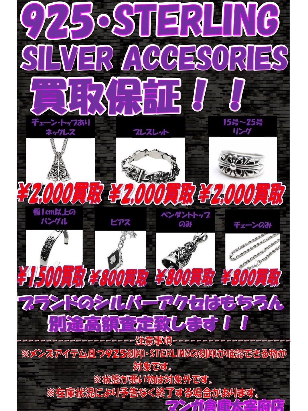 古着コーナー 925・STERLINGシルバーアクセの買取保証始めました💪✨◆ #925 #STERLING #silveraccessory #シルバーアクセサリー #ファッション #福岡 #太宰府 #マンガ倉庫太宰府店 ファッション 買取告知 2025年10月11日 古着からお知らせ!! Part2! 925・STERLINGシルバーアクセの買取保証始めました💪✨ 925及びSTERLINGの刻印が確認でき、美品であればそれぞれのアイテムを画像に記載の金額で買取保証致します!! もちろん高額商品は別途査定致します!! たくさんのお持ち込みお待ちしております(*´꒳`*) ★店舗《Instagram / Twitter》フォローお願いします★ ★買取告知・イベント情報はこちら★ ★各部門の買取・入荷情報はこちら★ 共有: クリックして X で共有 (新しいウィンドウで開きます) X Facebook で共有するにはクリックしてください (新しいウィンドウで開きます) Facebook