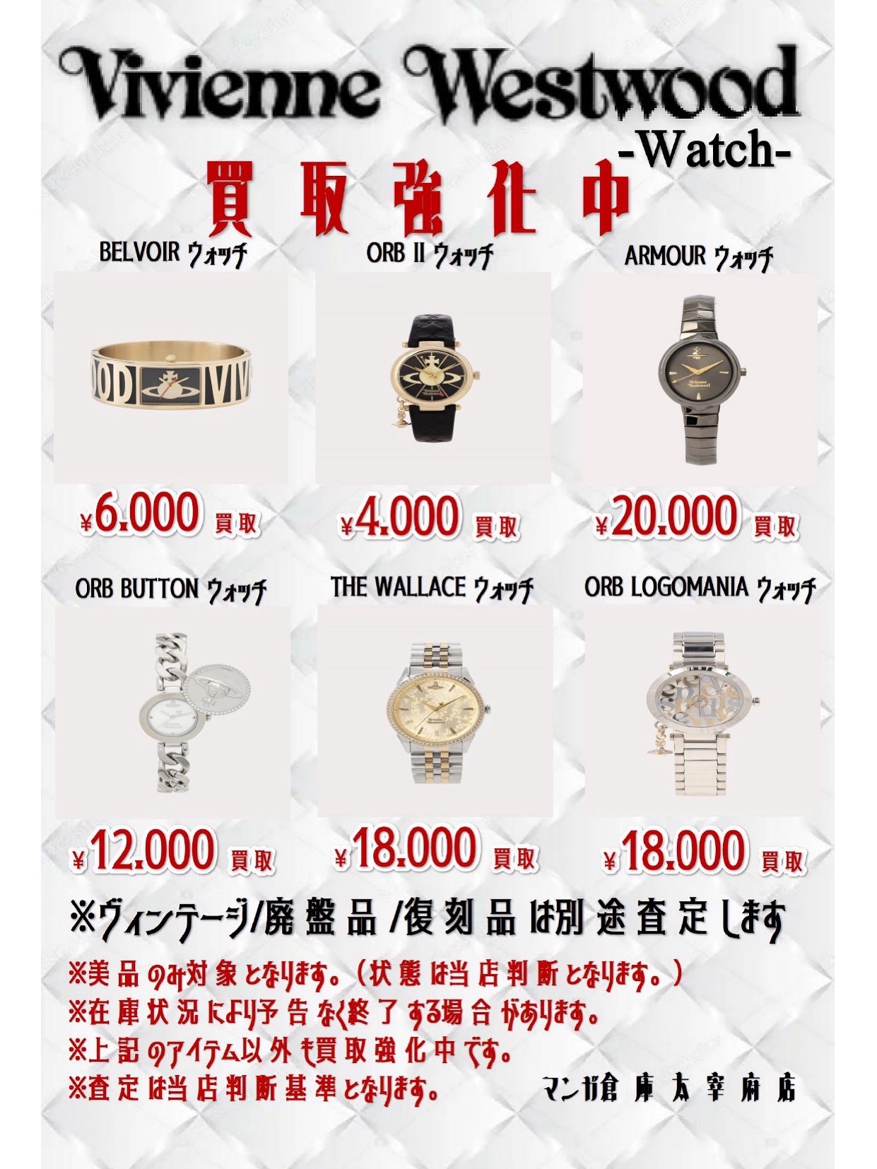 VivienneWestwood 時計も買取強化中です!!◆ #マンガ倉庫太宰府店 #viviennewestwood #ヴィヴィアンウエストウッド #アクセサリー #accessory #watch #時計 #買取 #太宰府 ファッション 買取告知 2025年10月11日 古着コーナーよりお知らせです! VivienneWestwood 時計も買取強化中です!! こちらも箱無し、箱あり大歓迎!!美品のみ対象となります! 時計も告知に記載してるアイテム以外も大歓迎なのでどしどし買取お待ちしてます!!! ★店舗《Instagram / Twitter》フォローお願いします★ ★買取告知・イベント情報はこちら★ ★各部門の買取・入荷情報はこちら★ 共有: クリックして X で共有 (新しいウィンドウで開きます) X Facebook で共有するにはクリックしてください (新しいウィンドウで開きます) Facebook