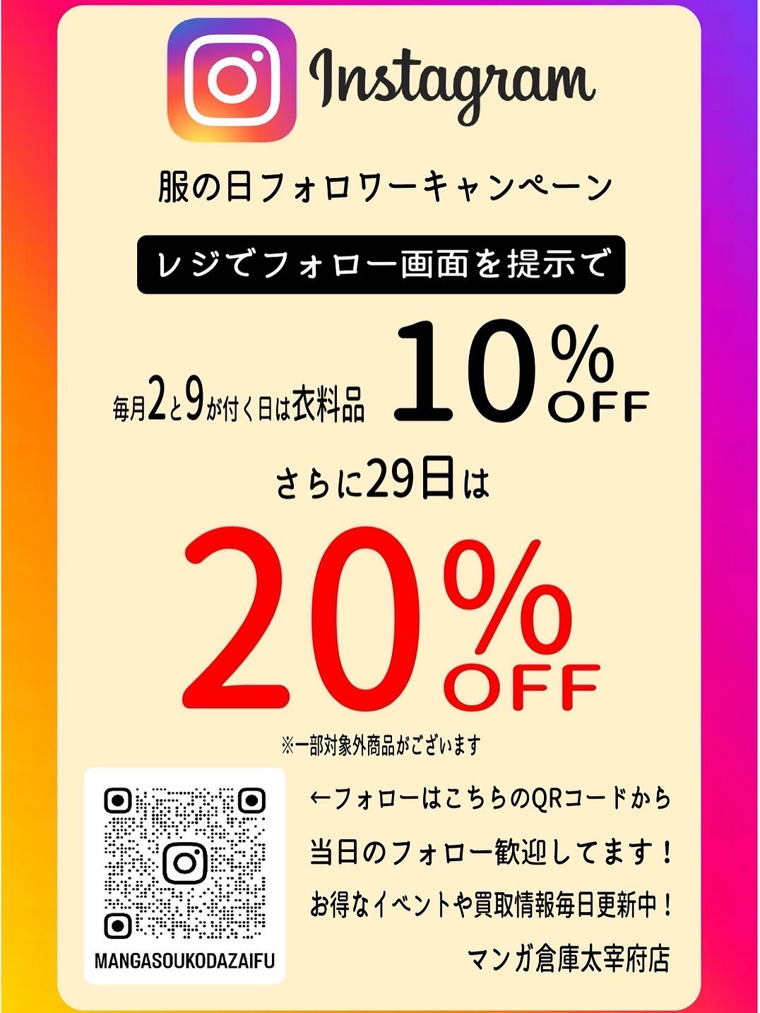■今日は9が付く日!!ということは… 古着の!インスタフォロワー様限定!服の日キャンペーン🤩🤩🤩■ #マンガ倉庫太宰府店 #古着 #古着屋 #服の日 #ファッション #イベント #買取 #太宰府 NEW ファッション マンガ倉庫大宰府店 2025年10月19日 古着コーナーよりお知らせです! 今日は9が付く日!!ということは… 古着の!インスタフォロワー様限定!服の日キャンペーン🤩🤩🤩 本日は10%OFF!これから大活躍する秋冬アイテムがお得に変えちゃう大チャンス💪💪 今すぐマンガ倉庫太宰府店のインスタをフォローして、お得に古着買っちゃいましょう〜🤩🤩 ★店舗《Instagram / Twitter》フォローお願いします★ ★買取告知・イベント情報はこちら★ ★各部門の買取・入荷情報はこちら★ 共有: クリックして X で共有 (新しいウィンドウで開きます) X Facebook で共有するにはクリックしてください (新しいウィンドウで開きます) Facebook
