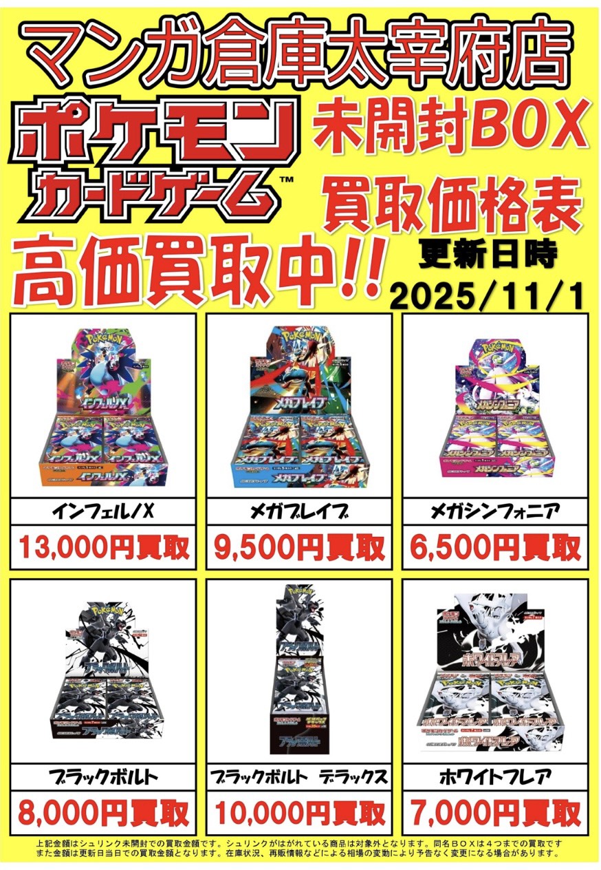 ☆★ポケモンカードの未開封BOXの買取価格を更新しました!★☆ #ポケモンカード #ポケカ #未開封BOX #BOX #インフェルノX #買取 #マンガ倉庫太宰府店 #太宰府 カード 買取告知 2025年11月1日 ポケモンカードの未開封BOXの買取価格を更新しました! 詳しくは店舗HPWEBチラシをご覧下さい! たくさんのお持ち込みお待ちしております! ※2025/11/1 現在の価格となります。 在庫状況・状態によってお値段が変動いたします。予めご了承ください。 ★店舗《Instagram / Twitter》フォローお願いします★ ★買取告知・イベント情報はこちら★ ★各部門の買取・入荷情報はこちら★ 共有: クリックして X で共有 (新しいウィンドウで開きます) X Facebook で共有するにはクリックしてください (新しいウィンドウで開きます) Facebook