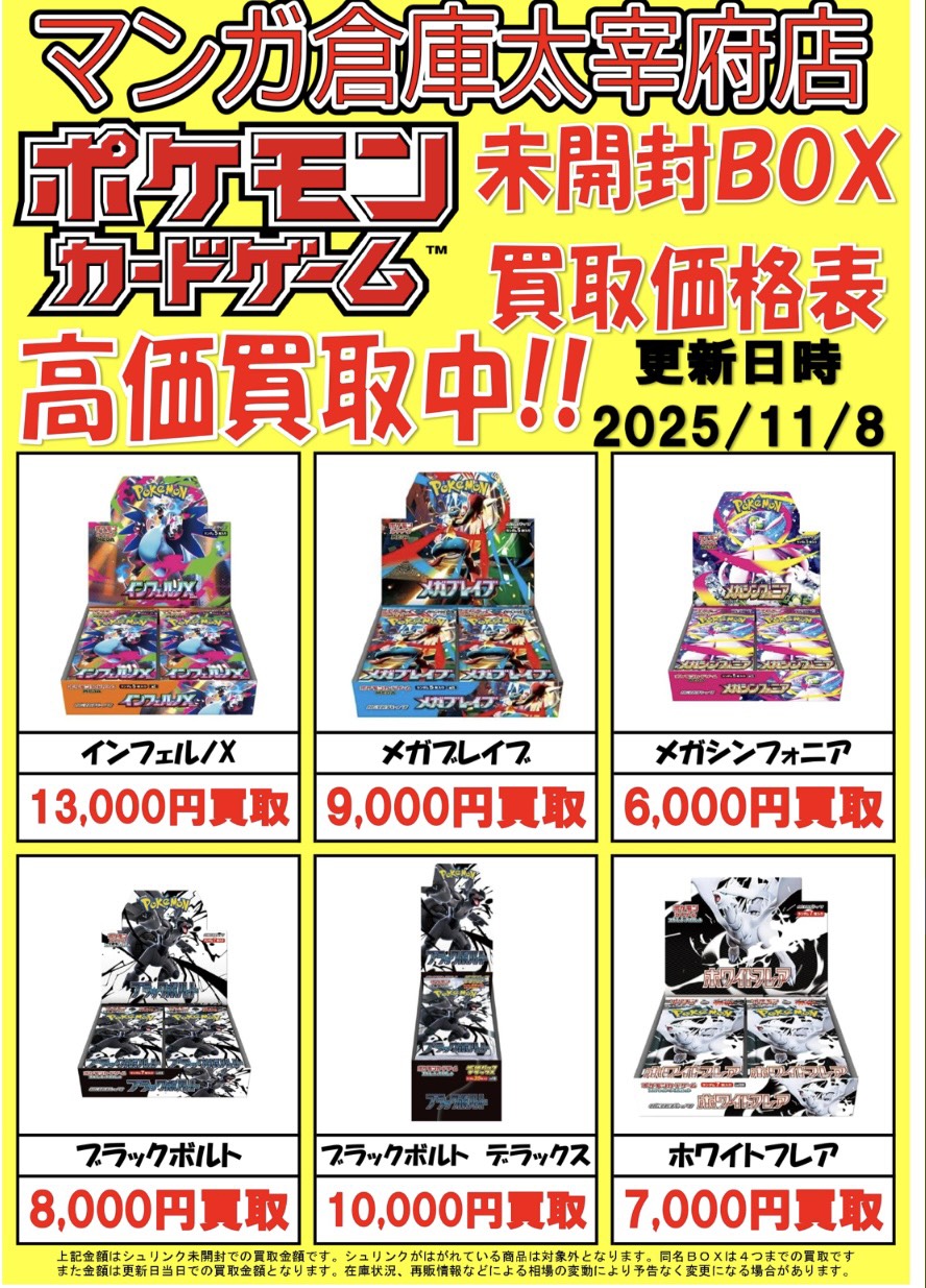 ■ポケモンカードの未開封BOXの買取価格を更新しました!◆#ポケモンカード #ポケカ #未開封BOX #BOX #インフェルノX #買取 #マンガ倉庫太宰府店 #太宰府■ NEW カード 買取告知 2025年11月8日 ポケモンカードの未開封BOXの買取価格を更新しました! 詳しくは店舗HPWEBチラシをご覧下さい! たくさんのお持ち込みお待ちしております! ※2025/11/8 現在の価格となります。 在庫状況などによってお値段が変動いたします。予めご了承ください。 ★店舗《Instagram / Twitter》フォローお願いします★ ★買取告知・イベント情報はこちら★ ★各部門の買取・入荷情報はこちら★ 共有: クリックして X で共有 (新しいウィンドウで開きます) X Facebook で共有するにはクリックしてください (新しいウィンドウで開きます) Facebook