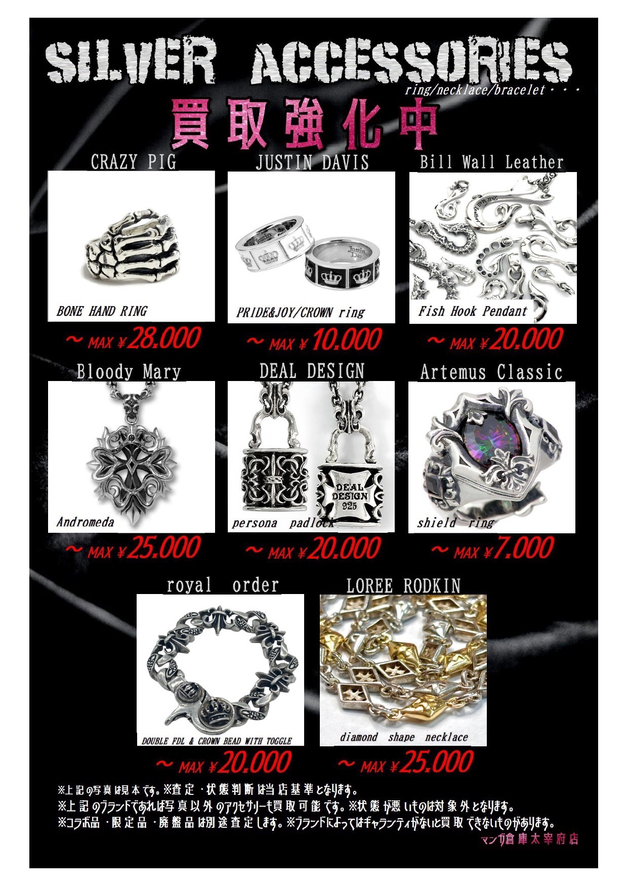 ■古着コーナーよりお知らせです!◆#マンガ倉庫太宰府店 #古着 #古着屋 #ファッション #fashion #シルバーアクセサリー #silveraccessories #silver925 #買取強化中 #福岡 #買取 #太宰府■ ファッション 買取告知 2025年11月8日 古着コーナーよりお知らせです! シルバーアクセサリーの買取強化も始めちゃいます!!! 昔シルバーアクセサリー集めてたけどもう使わなくなったそこのあなた!! ぜひマンガ倉庫太宰府店にたくさんお待ち込みください!!!! ※2025/11/8 現在の価格となります。 在庫状況などによってお値段が変動いたします。予めご了承ください。 ★店舗《Instagram / Twitter》フォローお願いします★ ★買取告知・イベント情報はこちら★ ★各部門の買取・入荷情報はこちら★ 共有: クリックして X で共有 (新しいウィンドウで開きます) X Facebook で共有するにはクリックしてください (新しいウィンドウで開きます) Facebook