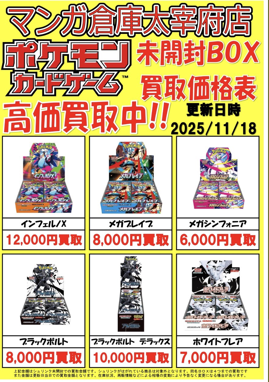 ■ポケモンカードの未開封BOXの買取価格を更新しました!◆#ポケモンカード #ポケカ #未開封BOX #BOX #買取 #マンガ倉庫太宰府店 #太宰府■ カード 買取告知 2025年11月18日 ポケモンカードの未開封BOXの買取価格を更新しました! 詳しくは店舗HPWEBチラシをご覧下さい!たくさんのお持ち込みお待ちしております! ※2025/11/18 現在の価格となります。 在庫状況などによってお値段が変動いたします。予めご了承ください。 ★店舗《Instagram / Twitter》フォローお願いします★ ★買取告知・イベント情報はこちら★ ★各部門の買取・入荷情報はこちら★ 共有: クリックして X で共有 (新しいウィンドウで開きます) X Facebook で共有するにはクリックしてください (新しいウィンドウで開きます) Facebook