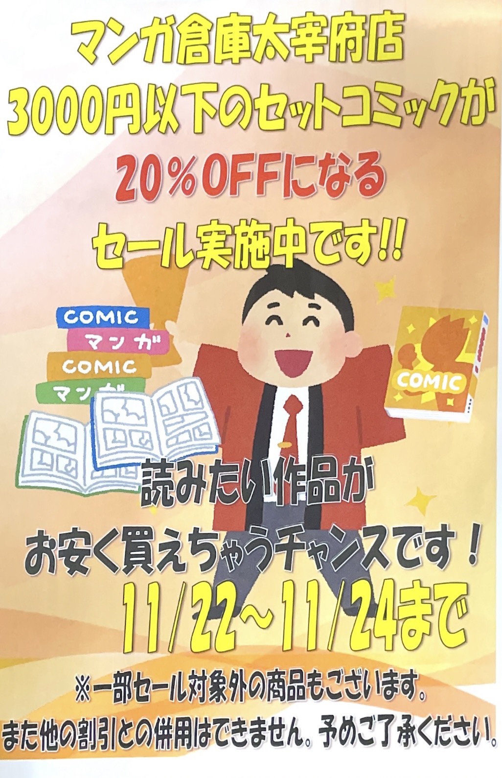 ■11/22から24までの3日間3000円以下のセットコミックお買い上げの場合、20%OFFになるセールを実施中!◆#コミック #セットコミック #セール #マンガ倉庫太宰府店 #太宰府■ イベント情報! コミック/書籍 2025年11月22日 11/22から24までの3日間3000円以下のセットコミックお買い上げの場合、20%OFFになるセールを実施中! まとめて読みたかったあの作品がお買い得に買えちゃうチャンスです!この機会をお見逃しなく! ※一部セール対象外商品がございます。またその他の割引企画などとの併用はできません。予めご了承下さい。 ★店舗《Instagram / Twitter》フォローお願いします★ ★買取告知・イベント情報はこちら★ ★各部門の買取・入荷情報はこちら★ 共有: クリックして X で共有 (新しいウィンドウで開きます) X Facebook で共有するにはクリックしてください (新しいウィンドウで開きます) Facebook