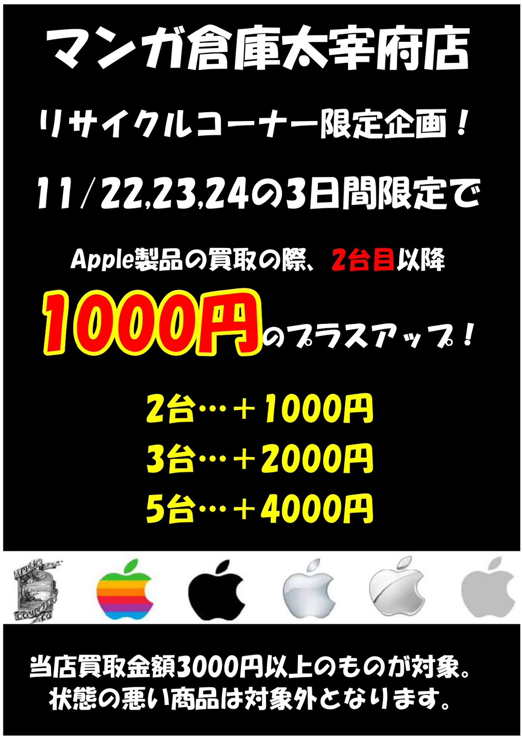 ★3連休もApple製品買取大強化!◆#Apple #買取 #福岡 #太宰府 #マンガ倉庫太宰府 #連休★ NEW 家電/雑貨 換金/酒/携帯/他 買取告知 2025年11月22日 3連休もApple製品買取大強化! 11/22~11/24の3日間 Apple製品2台以上お持ち込み頂くと2台目以降1,000円のプラスアップ! Apple製品売るならぜひマンガ倉庫太宰府店で! ※2025/11/22 現在の価格となります。 在庫状況などによってお値段が変動いたします。予めご了承ください。 ★店舗《Instagram / Twitter》フォローお願いします★ ★買取告知・イベント情報はこちら★ ★各部門の買取・入荷情報はこちら★ 共有: クリックして X で共有 (新しいウィンドウで開きます) X Facebook で共有するにはクリックしてください (新しいウィンドウで開きます) Facebook