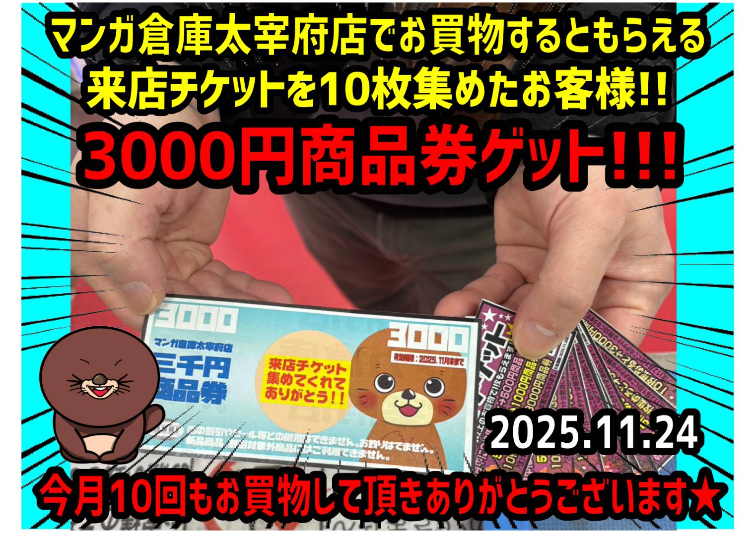 今月も10回来店して3000円商品券をゲットするお客様が続出中!!#マンガ倉庫太宰府店 #来店チケット #商品券 #福岡 #太宰府 #イベント イベント情報! 2025年11月24日 今月も10回来店して3000円商品券をゲットするお客様が続出中!! 来るほどオトクなマンガ倉庫太宰府店にアナタもぜひご来店を★ ★店舗《Instagram / Twitter》フォローお願いします★ ★買取告知・イベント情報はこちら★ ★各部門の買取・入荷情報はこちら★ 共有: クリックして X で共有 (新しいウィンドウで開きます) X Facebook で共有するにはクリックしてください (新しいウィンドウで開きます) Facebook