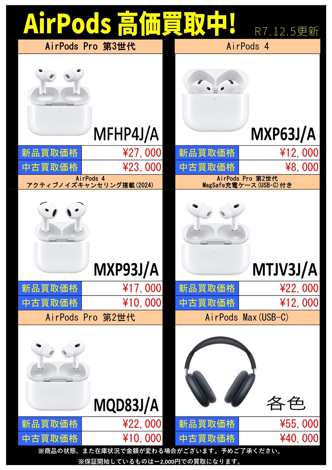 ■AirPods買取告知更新しました!◆#AirPods #Apple #買取 #福岡 #太宰府 #マンガ倉庫太宰府店■ NEW 家電/雑貨 換金/酒/携帯/他 買取告知 2025年12月5日 AirPods買取告知更新しました! マンガ倉庫太宰府店はApple製品買取大強化中! ぜひ当店にお持ち込みください! ※2025/12/5 現在の価格となります。 在庫状況などによってお値段が変動いたします。予めご了承ください。 ★店舗《Instagram / Twitter》フォローお願いします★ ★買取告知・イベント情報はこちら★ ★各部門の買取・入荷情報はこちら★ 共有: クリックして X で共有 (新しいウィンドウで開きます) X Facebook で共有するにはクリックしてください (新しいウィンドウで開きます) Facebook
