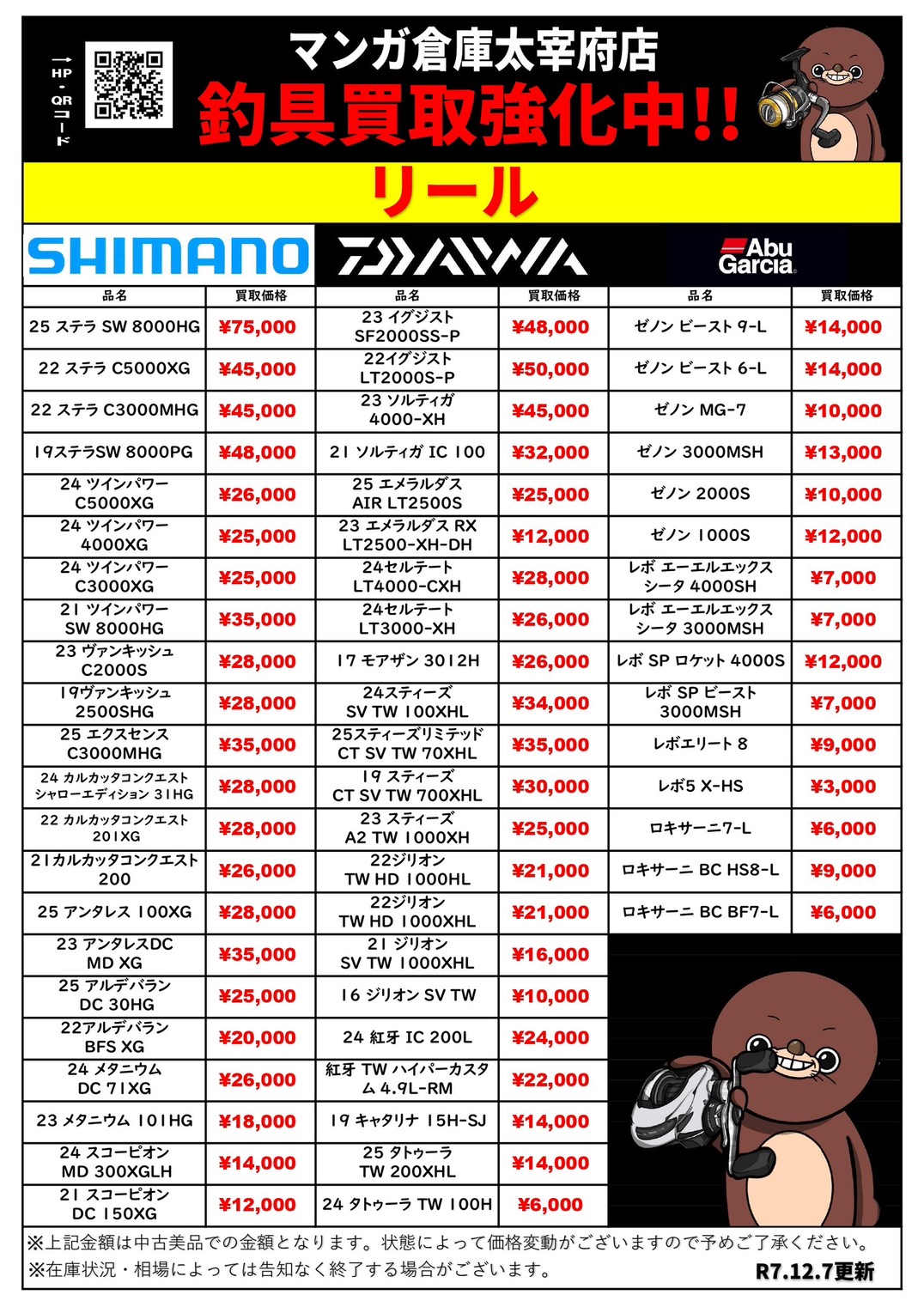 釣具コーナー ロッドに続きリールの買取告知も更新しました!◆ #釣具 #ルアー #買取 #福岡 #太宰府 #マンガ倉庫太宰府店 買取告知 釣具 2025年12月7日 釣具コーナー🎣🎣 ロッドに続きリールの買取告知も更新しました! お持ち込みはぜひマンガ倉庫太宰府店へ! ※2025/12/7 現在の価格となります。 在庫状況・状態によってお値段が変動いたします。予めご了承ください。 ★店舗《Instagram / Twitter》フォローお願いします★ ★買取告知・イベント情報はこちら★ ★各部門の買取・入荷情報はこちら★ 共有: クリックして X で共有 (新しいウィンドウで開きます) X Facebook で共有するにはクリックしてください (新しいウィンドウで開きます) Facebook