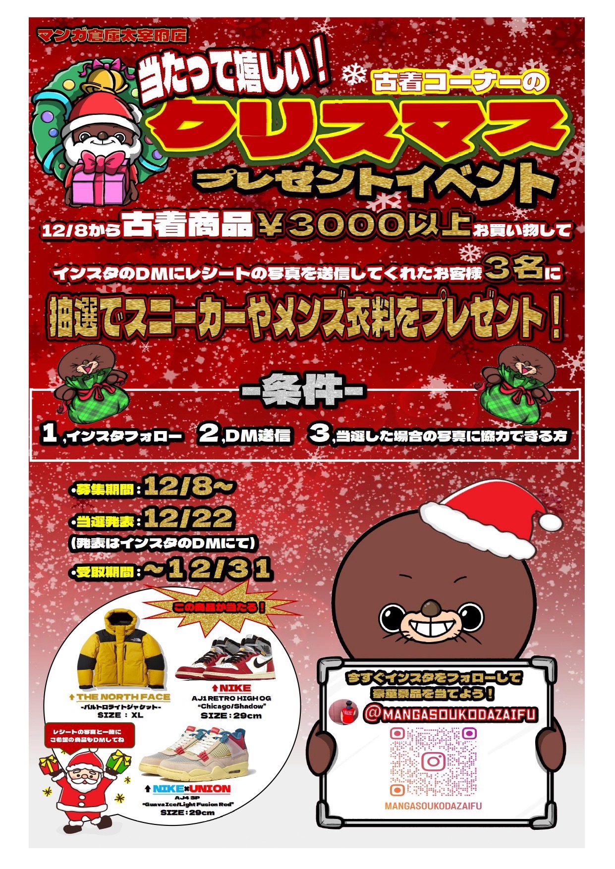 古着商品3000円以上のお買い物をして こちらのインスタのアカウントのDMに購入したレシートとチラシに載ってる当たって欲しい商品を送ってくれたお客様 限定3名様に 抽選でスニーカーやメンズ衣料をプレゼント🎁🎄🎅