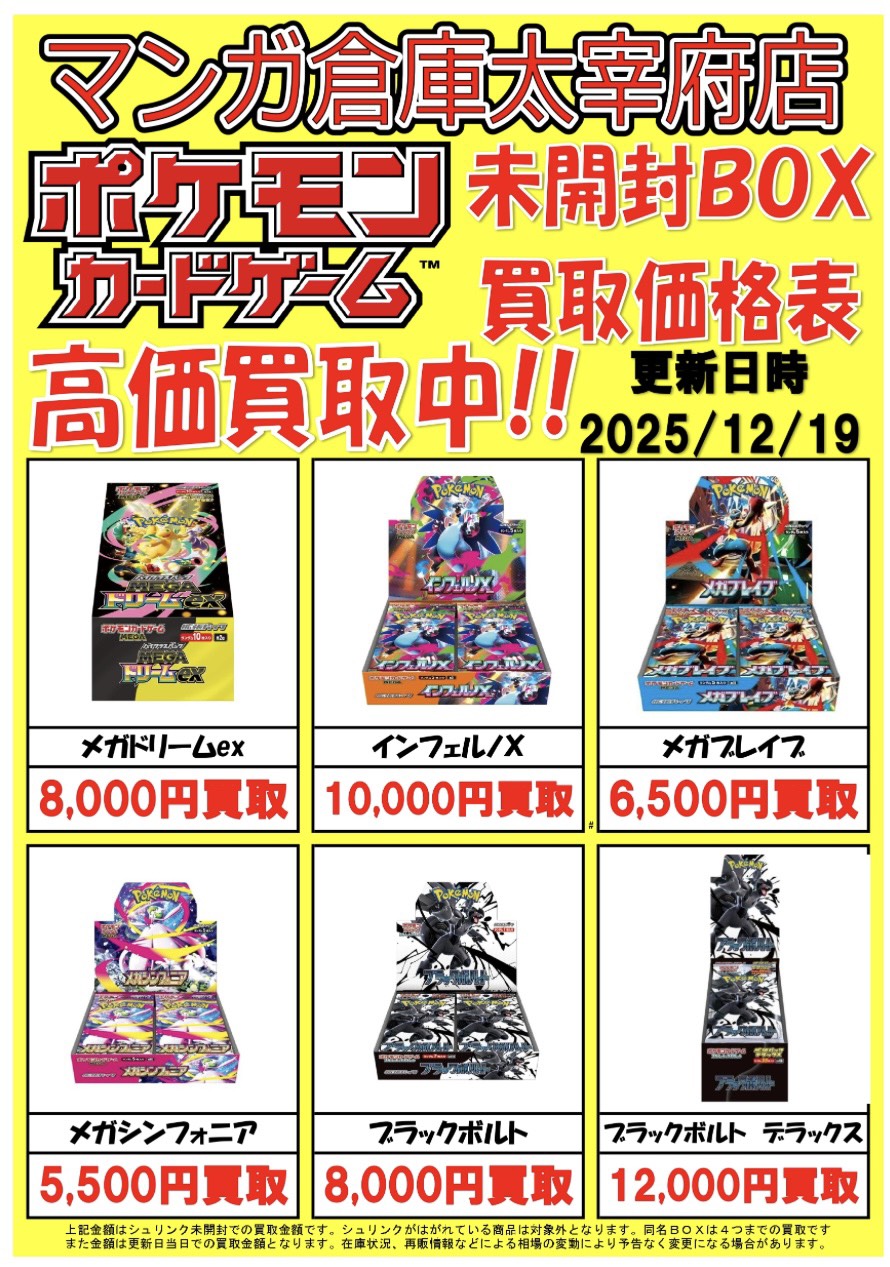 ☆★ポケモンカードの未開封BOXの買取価格を更新しました!★☆ #ポケモンカード #ポケカ #未開封BOX #BOX #買取 #マンガ倉庫太宰府店 #太宰府 NEW カード 買取告知 2025年12月20日 ポケモンカードの未開封BOXの買取価格を更新しました! 詳しくは店舗HPWEBチラシをご覧下さい! たくさんのお持ち込みお待ちしております! ※2025/12/20現在の価格となります。 在庫状況・状態によってお値段が変動いたします。予めご了承ください。 ★店舗《Instagram / Twitter》フォローお願いします★ ★買取告知・イベント情報はこちら★ ★各部門の買取・入荷情報はこちら★ 共有: クリックして X で共有 (新しいウィンドウで開きます) X Facebook で共有するにはクリックしてください (新しいウィンドウで開きます) Facebook