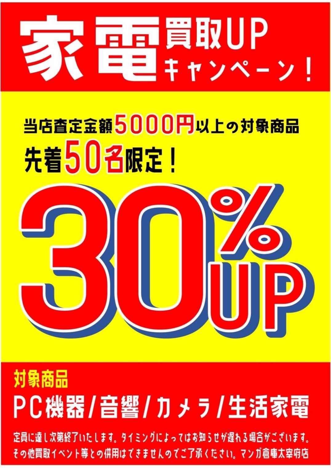 ■PC機器、音響、カメラ、生活家電「先着50名限定!」 30%UP!!■ #pc #音響 #カメラ #家電 #買取 #福岡 #太宰府 #マンガ倉庫太宰府店 家電/雑貨 買取告知 2025年12月20日 家電コーナーイベントまだあります! PC機器、音響、カメラ、生活家電 当店査定金額5,000円以上の対象商品 「先着50名限定!」 30%UP!! 定員に達し次第終了ですので 対象商品の買取はお早めにマンガ倉庫太宰府店までお持ち込みください!! ★店舗《Instagram / Twitter》フォローお願いします★ ★買取告知・イベント情報はこちら★ ★各部門の買取・入荷情報はこちら★ 共有: クリックして X で共有 (新しいウィンドウで開きます) X Facebook で共有するにはクリックしてください (新しいウィンドウで開きます) Facebook