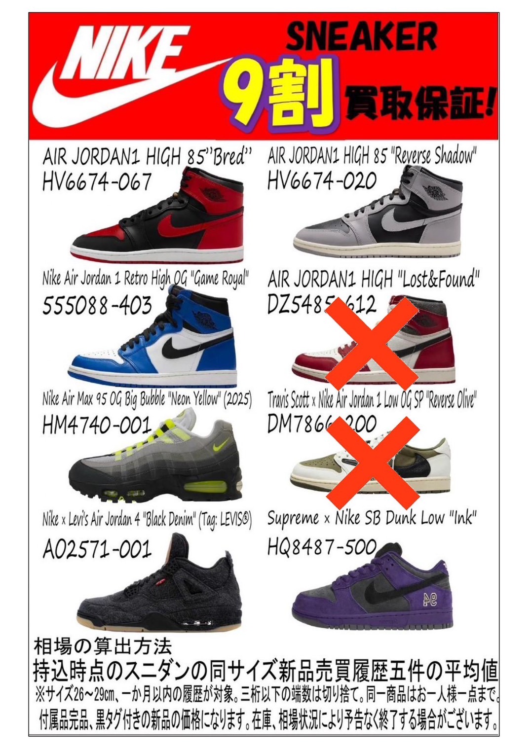 ■古着よりお知らせです!!◆ #NIKE #ナイキ #sneakers #スニーカー #古着 #ファッション #福岡 #太宰府 #マンガ倉庫太宰府店■ ファッション 買取告知 2026年1月8日 古着よりお知らせです!! 先日打ち出した✨NIKEのスニーカー9割保証✨ですが、早くも2足お持ち込みいただきました🎉 在庫が集まり次第終了する場合もありますので、お早めにお持ち込みくださいませ!! ※2026/1/8 現在の価格となります。 在庫状況などによってお値段が変動いたします。予めご了承ください。 ★店舗《Instagram / Twitter》フォローお願いします★ ★買取告知・イベント情報はこちら★ ★各部門の買取・入荷情報はこちら★ 共有: クリックして X で共有 (新しいウィンドウで開きます) X Facebook で共有するにはクリックしてください (新しいウィンドウで開きます) Facebook