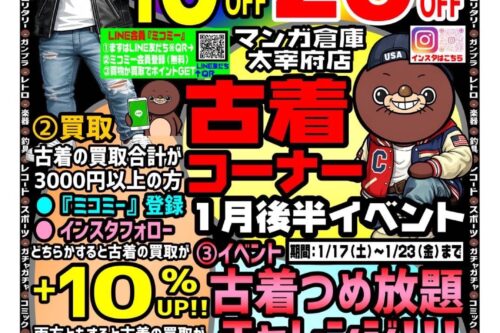 ■古着コーナーイベント開催中!◆#マンガ倉庫太宰府店 #買取プラスアップ #詰め放題 #イベント開催 #ファッション #fashion #古着 #買取 #太宰府■ イベント情報! ファッション 2026年1月20日 古着コーナーイベント開催中! LINEミコミー登録とインスタをフォローするとお会計も買取もお得になったり、古着詰め放題チャレンジなどイベント盛りだくさん! たくさんのお客様にご利用頂いております! セールも詰め放題も良いものからなくなります! ご来店はお早めに! ★店舗《Instagram / Twitter》フォローお願いします★ ★買取告知・イベント情報はこちら★ ★各部門の買取・入荷情報はこちら★ 共有: クリックして X で共有 (新しいウィンドウで開きます) X Facebook で共有するにはクリックしてください (新しいウィンドウで開きます) Facebook