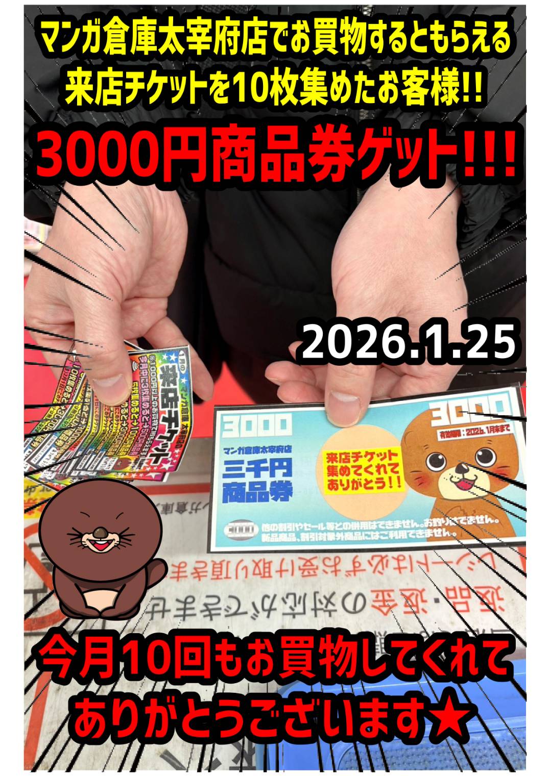 ■今月も10回来店して3000円商品券をゲットするお客様が続出中!!◆#マンガ倉庫太宰府店 #来店チケット #商品券 #福岡 #太宰府 #イベント■ イベント情報! 2026年1月25日 今月も10回来店して3000円商品券をゲットするお客様が続出中!! 来るほどオトクなマンガ倉庫太宰府店にアナタもぜひご来店を★ ★店舗《Instagram / Twitter》フォローお願いします★ ★買取告知・イベント情報はこちら★ ★各部門の買取・入荷情報はこちら★ 共有: クリックして X で共有 (新しいウィンドウで開きます) X Facebook で共有するにはクリックしてください (新しいウィンドウで開きます) Facebook