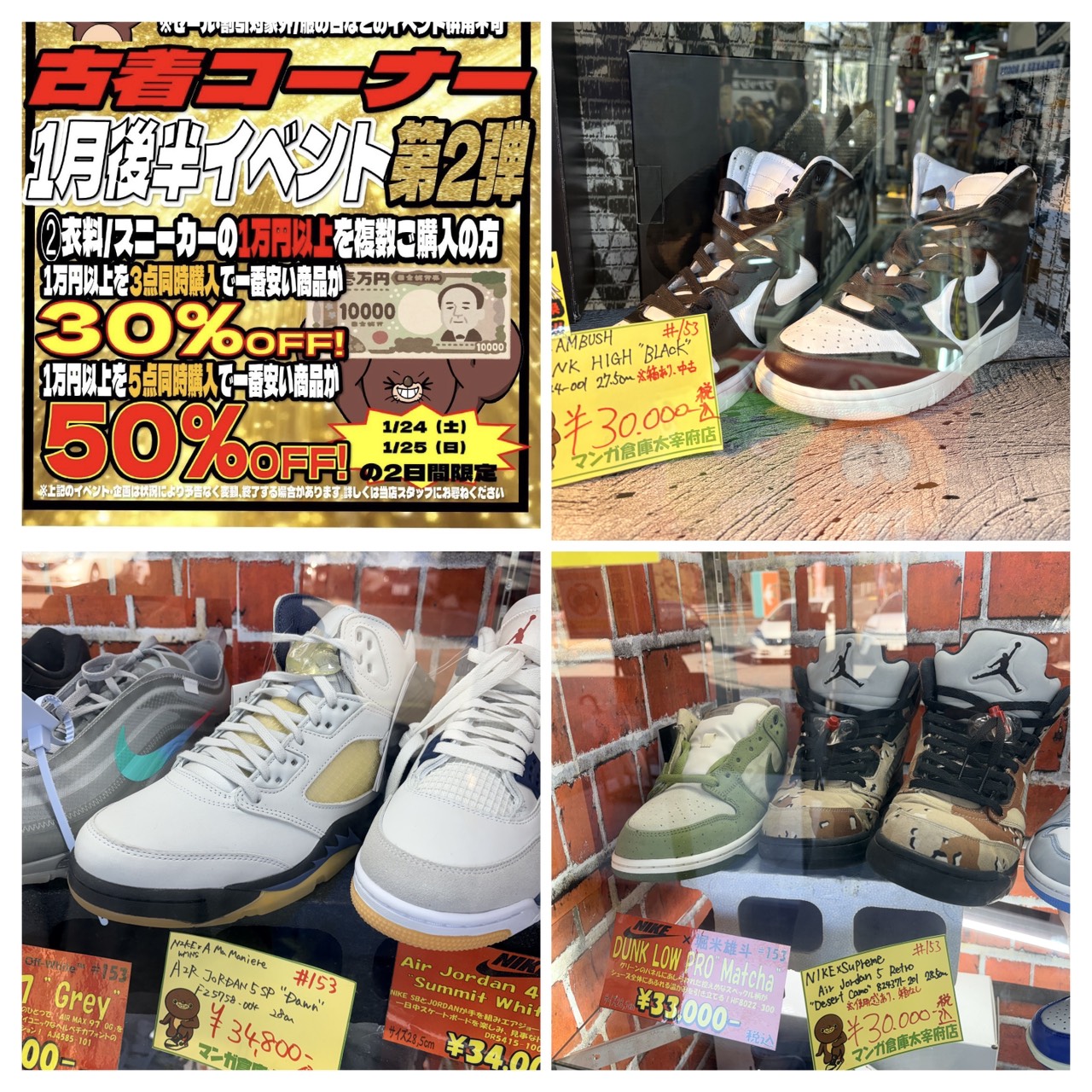 ■《1月25日》1万円以上を複数ご購入でその中で一番安い商品がお安くなるSALE開催中!◆#古着 #セール #ファッション #スニーカー #福岡 #太宰府 #マンガ倉庫太宰府店■ イベント情報! ファッション 2026年1月25日 1万円以上を複数ご購入でその中で一番安い商品がお安くなるSALE開催中! 3点同時購入で30% 5点同時購入でなんと50%OFF!! スニーカーも対象です! いいものからなくなります! この機会をお見逃しなく! ※2026/1/25 現在の価格となります。 在庫状況などによってお値段が変動いたします。予めご了承ください。 ★店舗《Instagram / Twitter》フォローお願いします★ ★買取告知・イベント情報はこちら★ ★各部門の買取・入荷情報はこちら★ 共有: クリックして X で共有 (新しいウィンドウで開きます) X Facebook で共有するにはクリックしてください (新しいウィンドウで開きます) Facebook