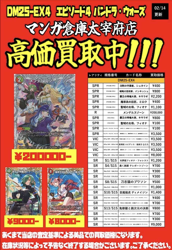 デュエマ最新弾DM25-EX4エピソード4 「パンドラ・ウォーズ」の買取査定表を更新いたしました‼️#マンガ倉庫太宰府店 #デュエマ #デュエルマスターズ #福岡 #太宰府 カード 買取告知 2026年2月14日 デュエマ最新弾DM25-EX4エピソード4 「パンドラ・ウォーズ」の買取査定表を更新いたしました‼️ ※2026/2/14現在の価格となっております。 相場、在庫状況により告知なく価格が変更となる場合がございますのでご了承ください。 ★店舗《Instagram / Twitter》フォローお願いします★ ★買取告知・イベント情報はこちら★ ★各部門の買取・入荷情報はこちら★ 共有: X で共有 (新しいウィンドウで開きます) X Facebook で共有 (新しいウィンドウで開きます) Facebook