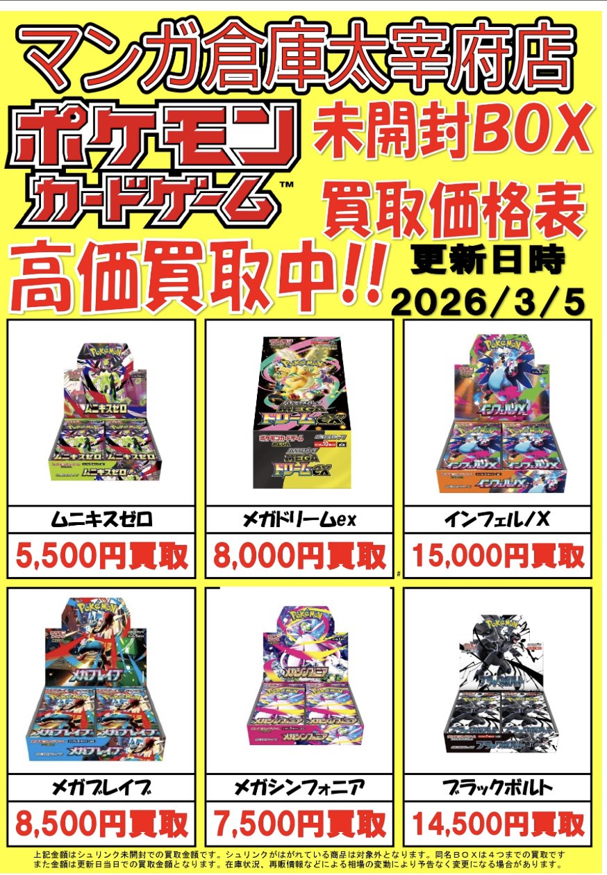 ■ポケモンカードの未開封BOXの買取価格を更新しました!◆#ポケモンカード #ポケカ #未開封BOX #BOX #買取 #マンガ倉庫太宰府店 #太宰府■ カード 買取告知 2026年3月5日 ポケモンカードの未開封BOXの買取価格を更新しました! 詳しくは店舗HPWEBチラシをご覧下さい!たくさんのお持ち込みお待ちしております! ※2026/3/5 現在の価格となります。 在庫状況などによってお値段が変動いたします。予めご了承ください。 ★店舗《Instagram / Twitter》フォローお願いします★ ★買取告知・イベント情報はこちら★ ★各部門の買取・入荷情報はこちら★ 共有: X で共有 (新しいウィンドウで開きます) X Facebook で共有 (新しいウィンドウで開きます) Facebook