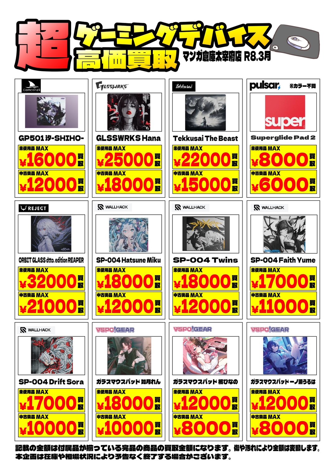 ゲーミングキーボードに続きマウスパッド買取告知更新しました!