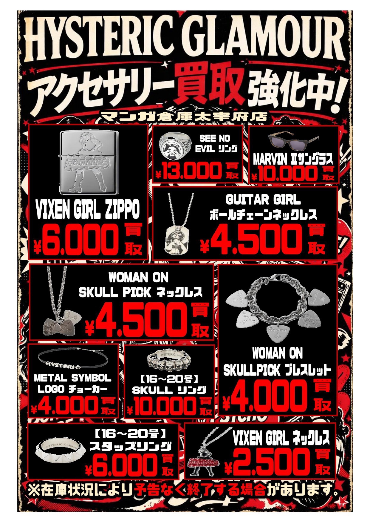 ■古着コーナーよりお知らせです!◆#マンガ倉庫太宰府店 #hystericglamour #ヒステリックグラマー #アクセサリー #accessories #fashion #ファッション #古着屋 #古着 #買取強化中 #買取 #太宰府■ ファッション 買取告知 2026年3月11日 古着コーナーよりお知らせです! Hysteric Glamourのアクセサリーの買取強化始めました! 告知に載せてる商品以外も買取OKです!! どしどし買取お待ちしてます❤️🔥 ※2026/3/11 現在の価格となります。 在庫状況などによってお値段が変動いたします。予めご了承ください。 ★店舗《Instagram / Twitter》フォローお願いします★ ★買取告知・イベント情報はこちら★ ★各部門の買取・入荷情報はこちら★ 共有: X で共有 (新しいウィンドウで開きます) X Facebook で共有 (新しいウィンドウで開きます) Facebook