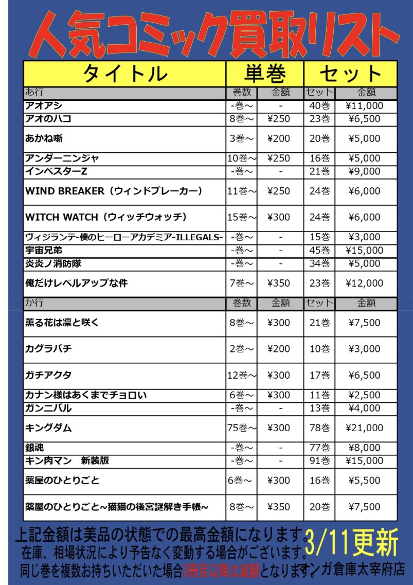コミック・セットコミックの買取価格表を更新致しました!