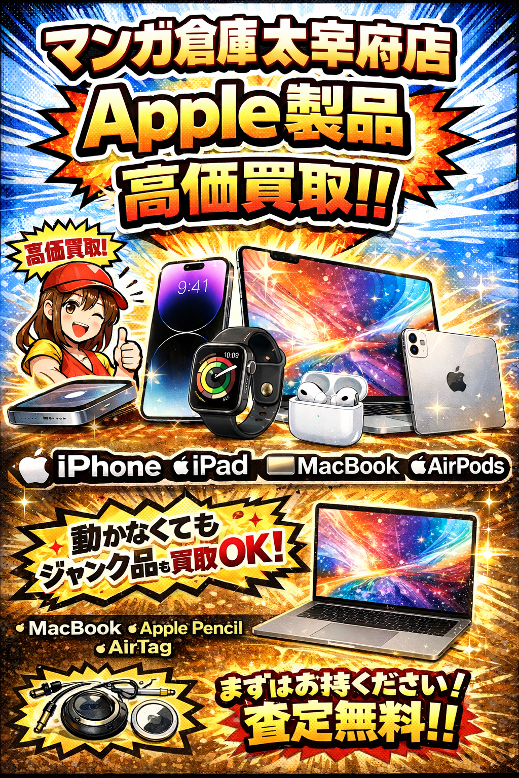 ■iPhone,iPad,AirPodsなどApple製品買取超強化中!◆#Apple #買取 #福岡 #太宰府 #マンガ倉庫太宰府店■ 家電/雑貨 買取告知 2026年3月13日 iPhone,iPad,AirPodsなどApple製品買取超強化中! Appleの買取はマンガ倉庫太宰府店まで! ★店舗《Instagram / Twitter》フォローお願いします★ ★買取告知・イベント情報はこちら★ ★各部門の買取・入荷情報はこちら★ 共有: X で共有 (新しいウィンドウで開きます) X Facebook で共有 (新しいウィンドウで開きます) Facebook