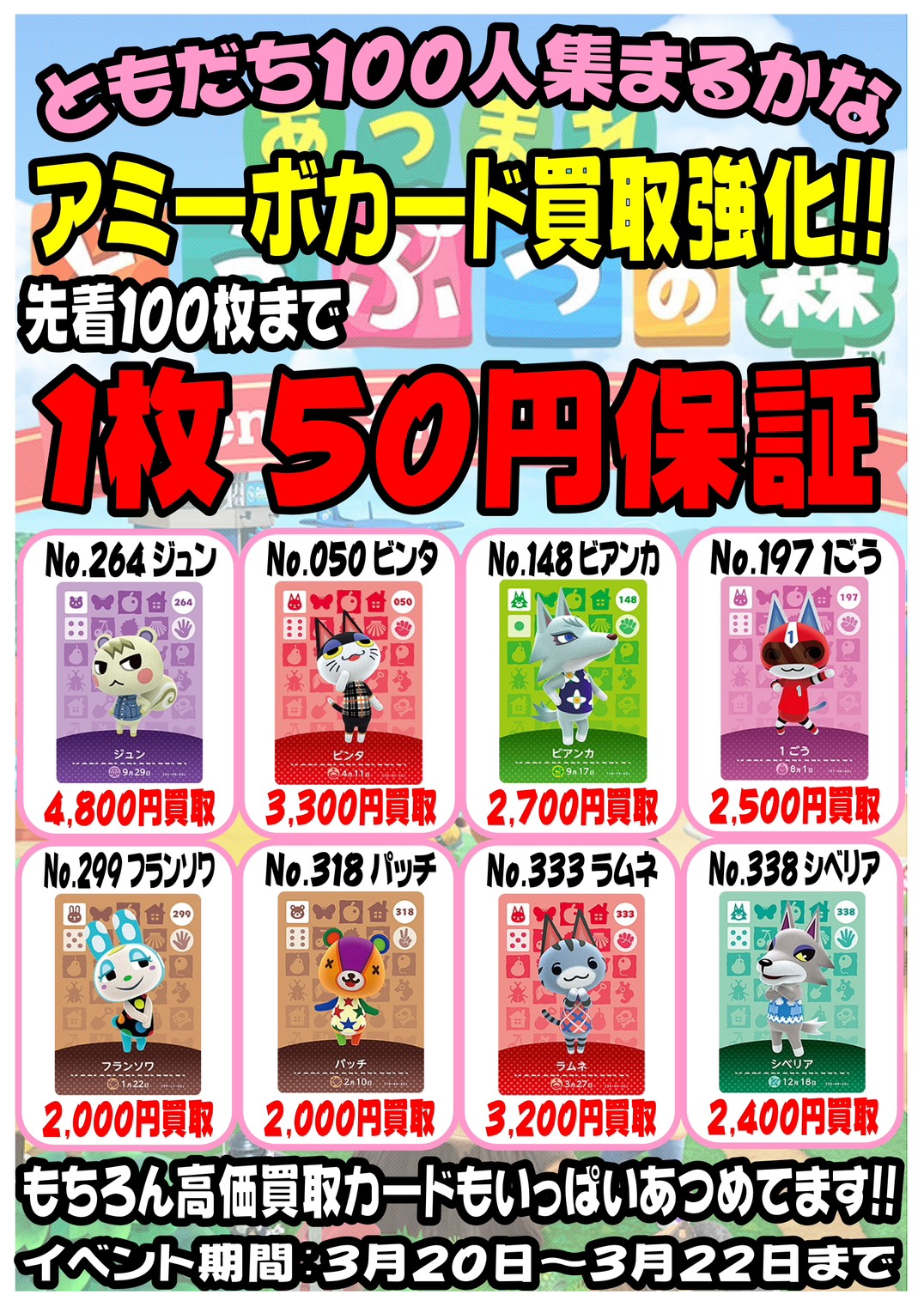 ■《3月20日~22日》マンガ倉庫太宰府店ゲームコーナーよりお知らせ‼◆#マンガ倉庫太宰府店 #アミーボカード #どうぶつの森 #ゲーム■ ゲーム 買取告知 2026年3月20日 マンガ倉庫太宰府店ゲームコーナーよりお知らせ‼ 只今amiiboカード高価買取中! 3連休中は50円買取保証も実施中です! 先着100枚までですのでお早めに買取にお持ち込み下さい。 ★店舗《Instagram / Twitter》フォローお願いします★ ★買取告知・イベント情報はこちら★ ★各部門の買取・入荷情報はこちら★ 共有: X で共有 (新しいウィンドウで開きます) X Facebook で共有 (新しいウィンドウで開きます) Facebook