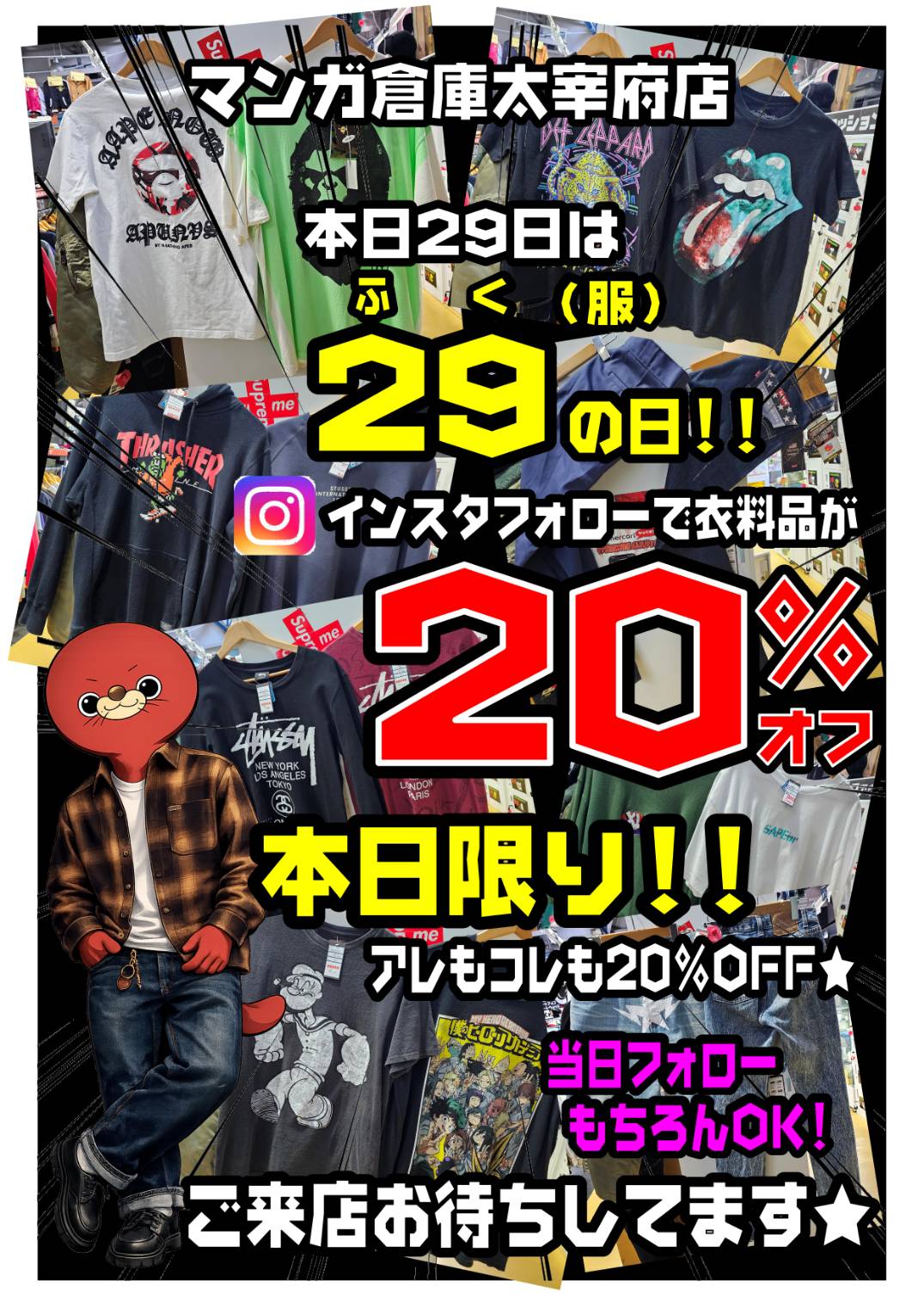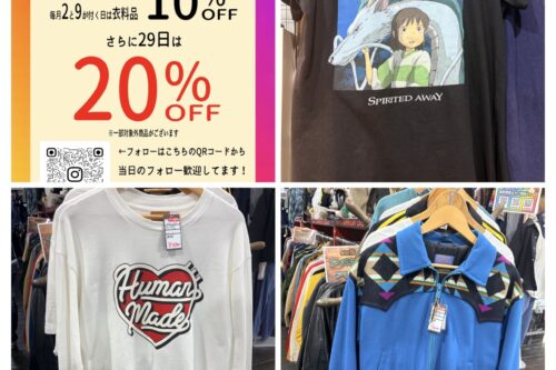 衣料品20%OFF★ 今日だけだよ~!!!#古着 #セール #福岡 #太宰府 #マンガ倉庫太宰府店 イベント情報! ファッション 2026年3月29日 衣料品20%OFF★ 今日だけだよ~!!! 桜は明日も見れるけど29(フク)の日は今日で終わっちゃうよ~!!! いいかんじの春夏衣料品モリモリのマンガ倉庫太宰府店に急げ★ ★店舗《Instagram / Twitter》フォローお願いします★ ★買取告知・イベント情報はこちら★ ★各部門の買取・入荷情報はこちら★ 共有: X で共有 (新しいウィンドウで開きます) X Facebook で共有 (新しいウィンドウで開きます) Facebook