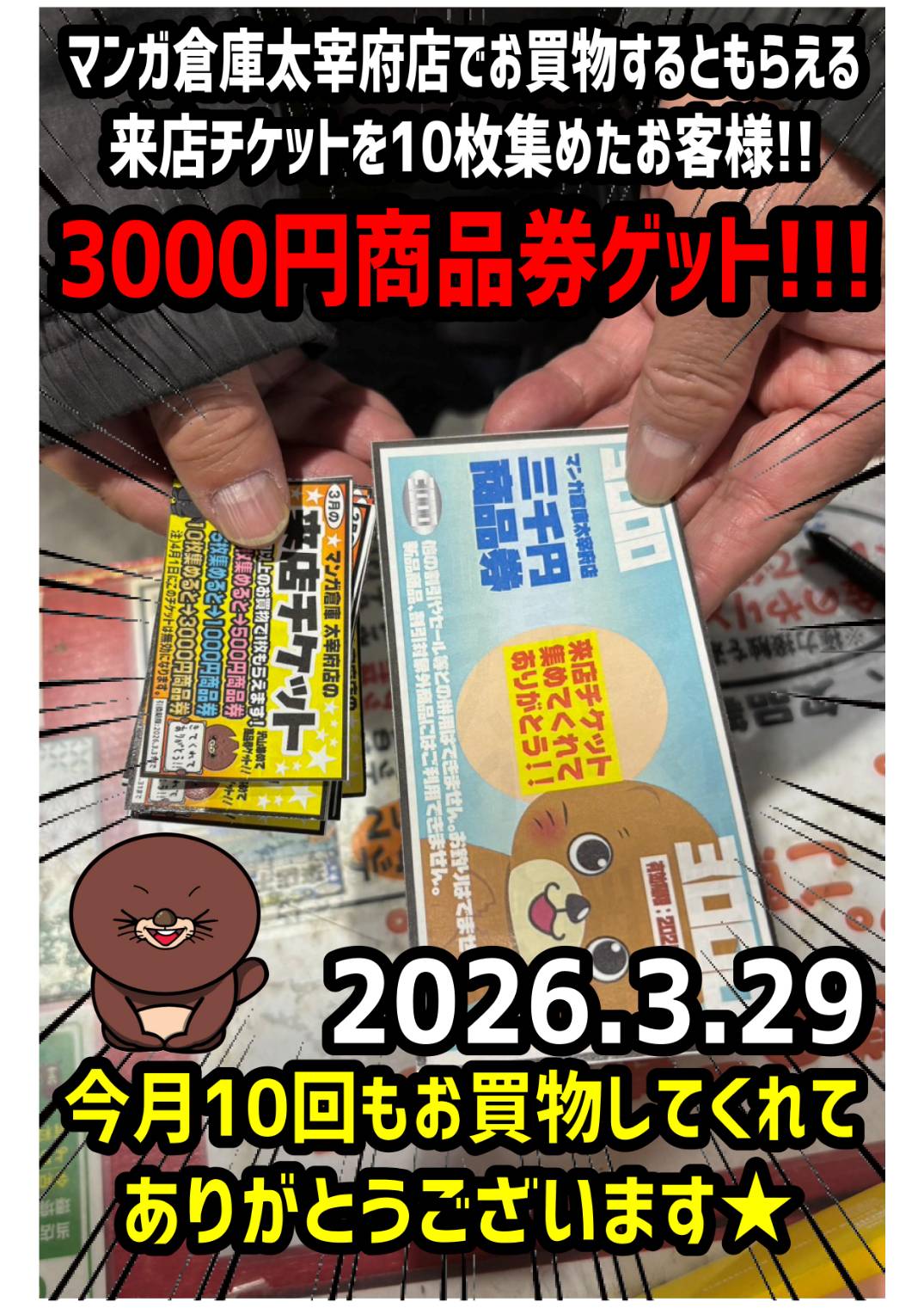 ■10回来店&お買い物をしたお客様、3000円商品券ゲットおめでとうございます!!◆#マンガ倉庫太宰府店 #来店チケット #商品券 #福岡 #太宰府 #イベント■ イベント情報! 2026年3月29日 10回来店&お買い物をしたお客様、3000円商品券ゲットおめでとうございます!! 今月も沢山のお客様が3000円商品券をゲット中です!!…3月も残りわずかなので御来店お急ぎ下さい! 来れば来るほどオトクなマンガ倉庫太宰府店にアナタもぜひご来店を★ ★店舗《Instagram / Twitter》フォローお願いします★ ★買取告知・イベント情報はこちら★ ★各部門の買取・入荷情報はこちら★ 共有: X で共有 (新しいウィンドウで開きます) X Facebook で共有 (新しいウィンドウで開きます) Facebook