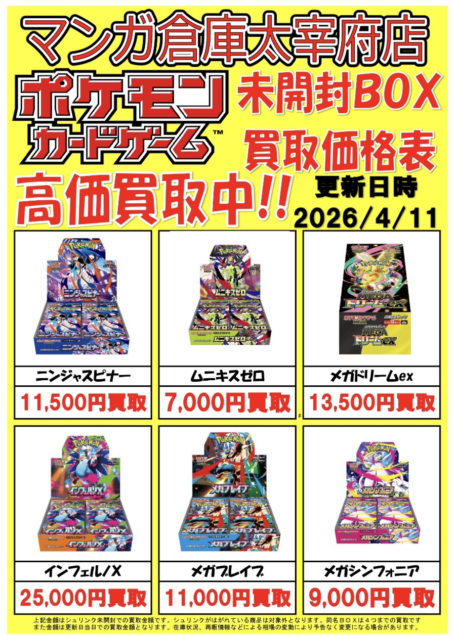 ポケモンカードの未開封BOXの買取価格を更新しました!毎日相場が変動しています!詳しくは店舗HPWEBチラシをご覧下さい!たくさんのお持ち込みお待ちしております!